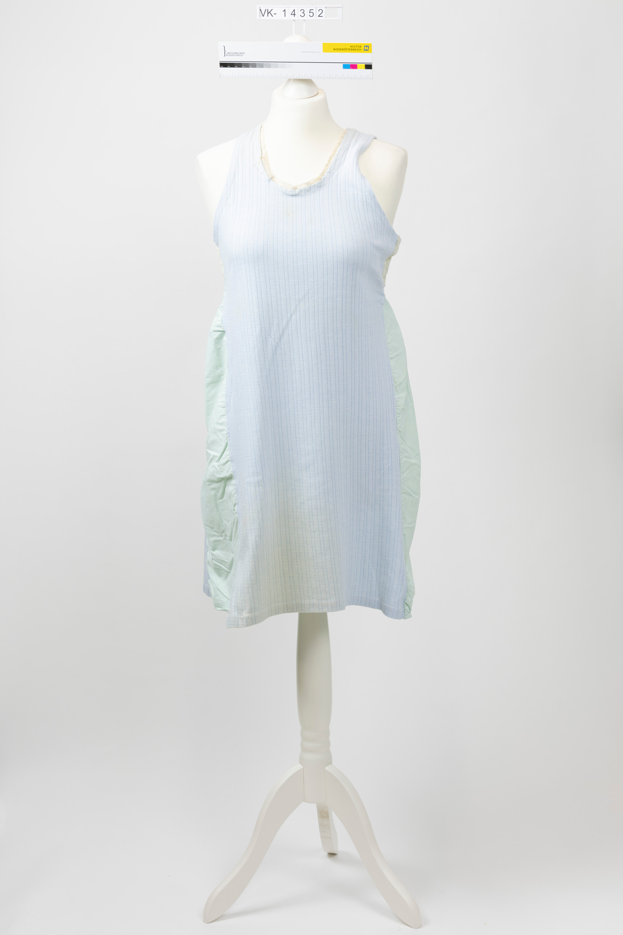 Hellblaues Nachthemd, ärmellos, im Ausschnitt mit weißer Spitze besetzt. Das Nachthemd ist durch den Einsatz zusätzlicher Stoffteile an beiden Seiten erweitert.