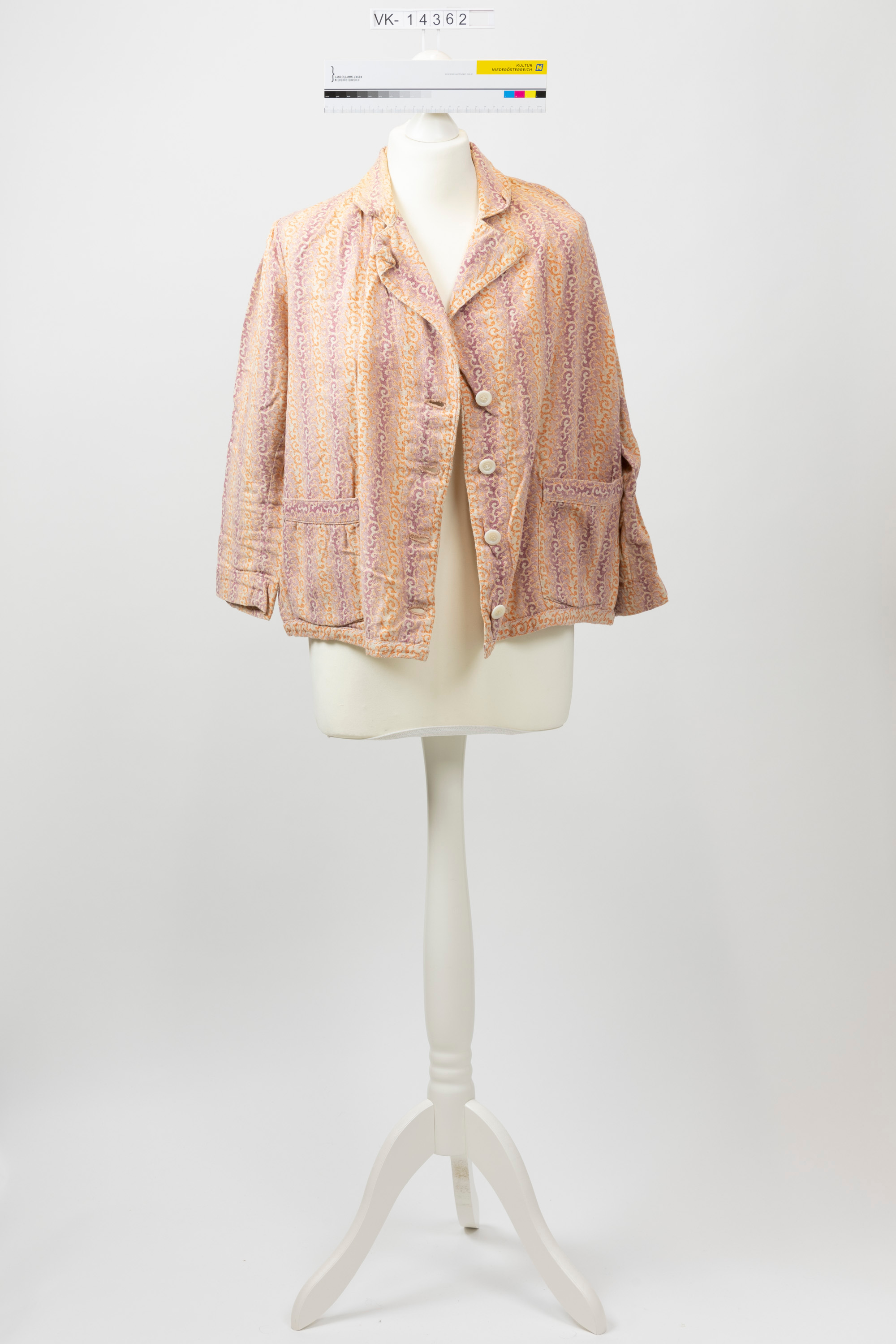 Kurze langärmelige Jacke aus ornamental gemustertem Stoff in weiß unterlegten, von violett zu orange verlaufenden Streifen, mit zwei Taschen, durchgehender Knopfleiste mit weißen Knöpfen und einem Reverskragen.