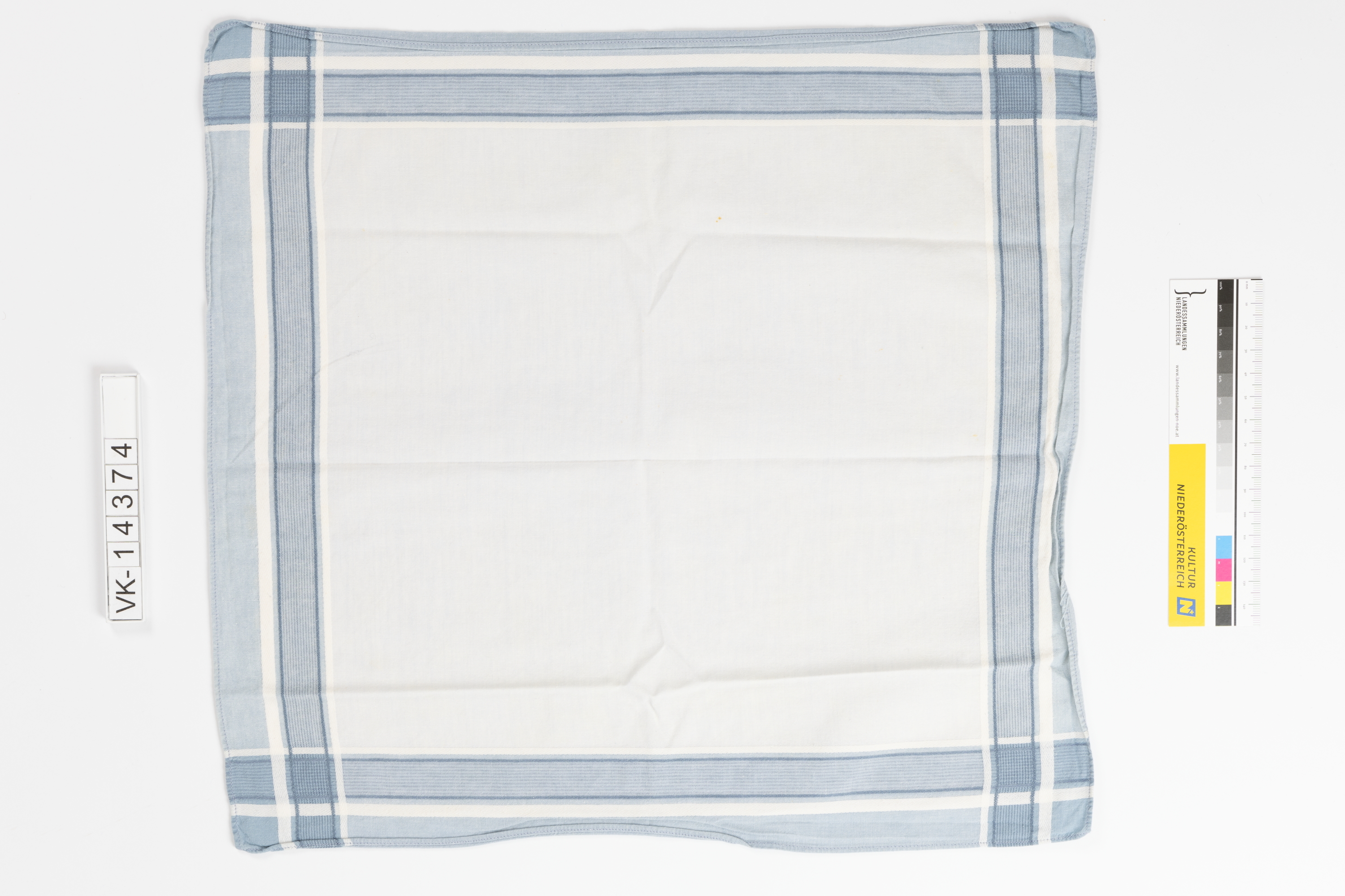 Weißes Stofftaschentuch mit graublauen Linien im Randbereich, die in den Ecken gekreuzt sind.