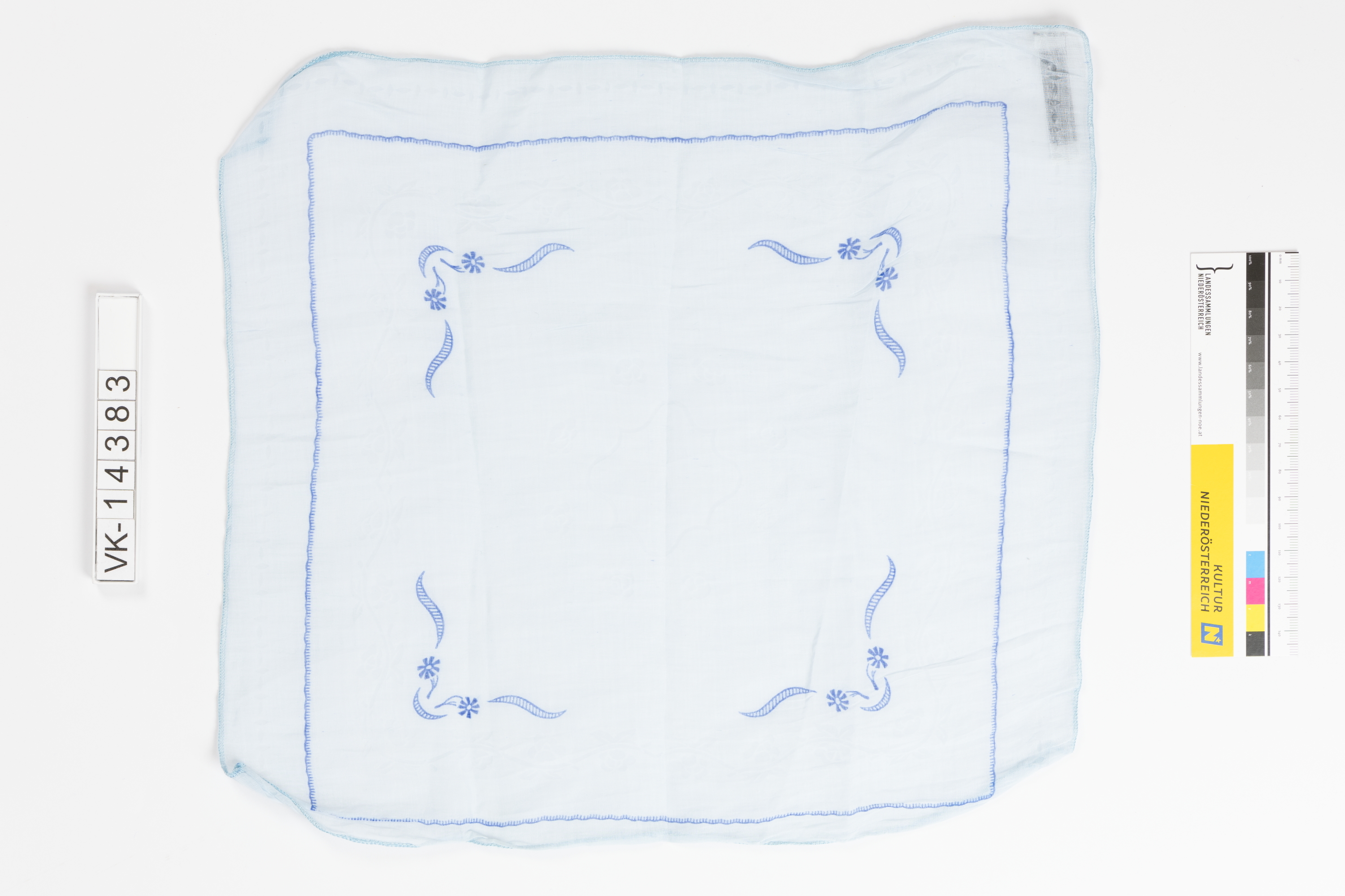 Hellblaues Stofftaschentuch mit blauer Naht, einer blauen umlaufenden Zierlinie im Randbereich und vier blauen Blütenelementen zur Mitte.