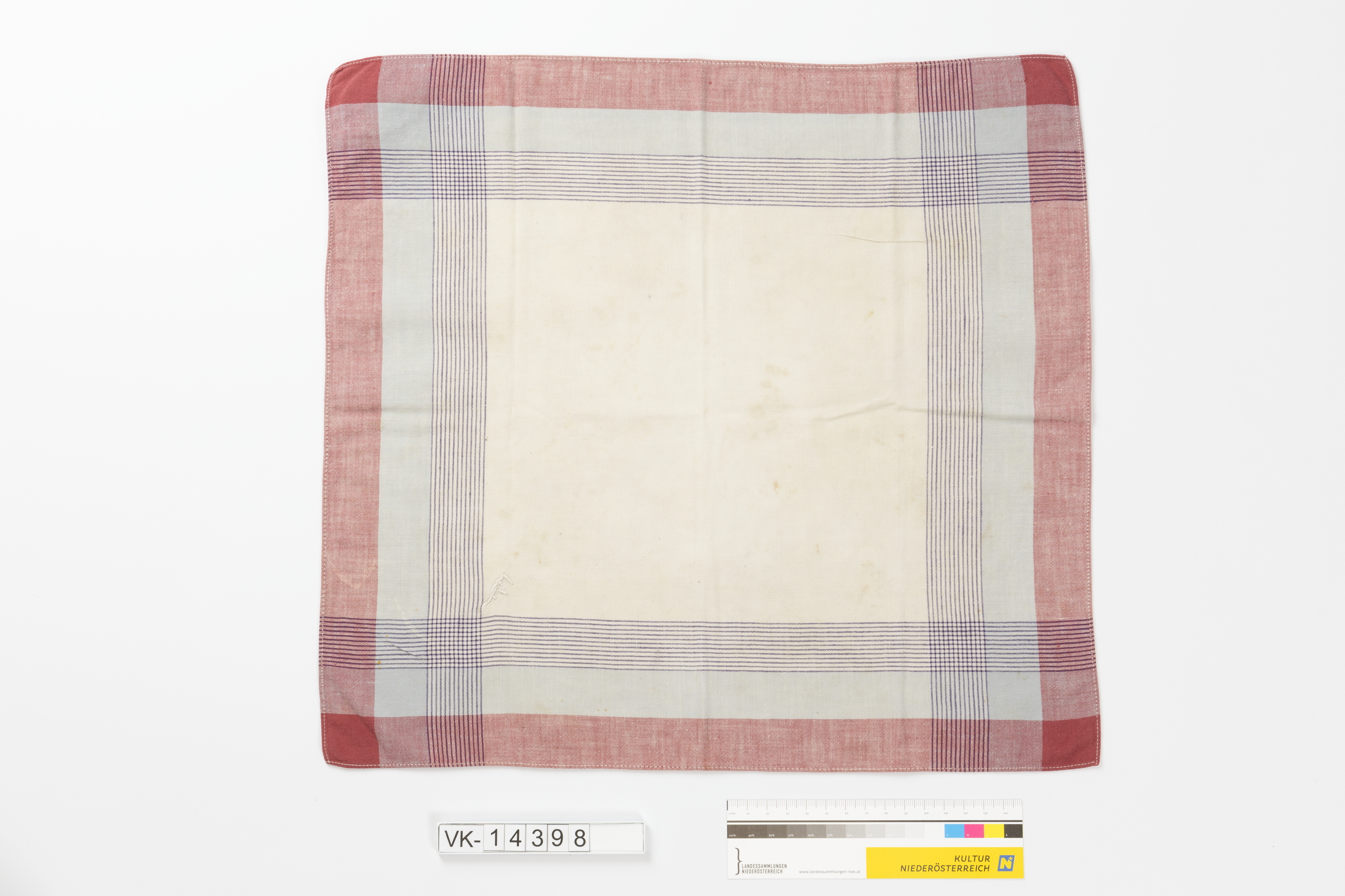 Quadratisches Stofftaschentuch mit schwarzen, hellblauen und roten Streifen, die sich in den Ecken kreuzen. Das Taschentuch ist mit einem Monogramm ("FF") bestickt.