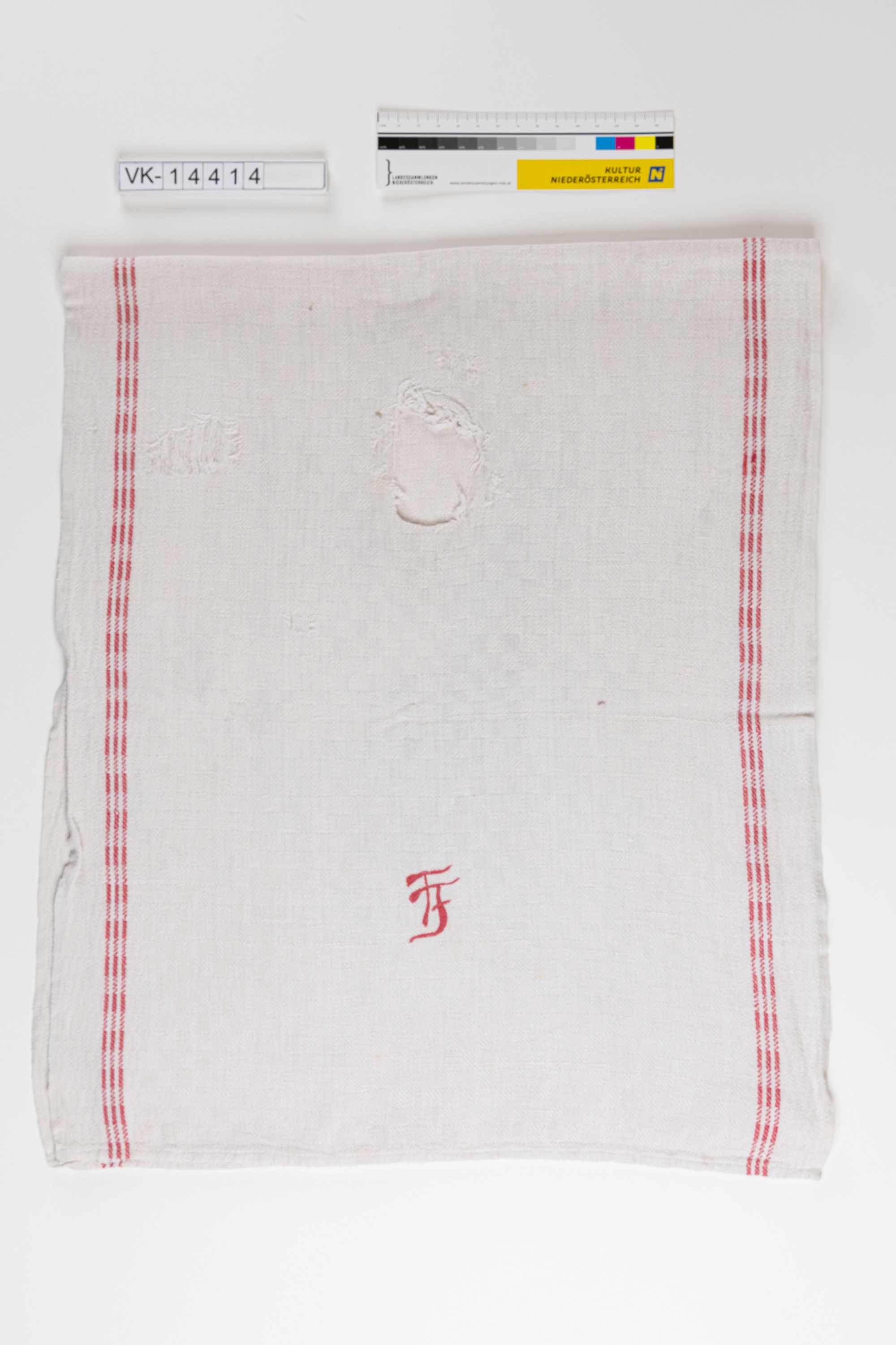 Weißes Handtuch mit roten Streifen an den Längsseiten und einer roten Monogrammstickerei: "TF".