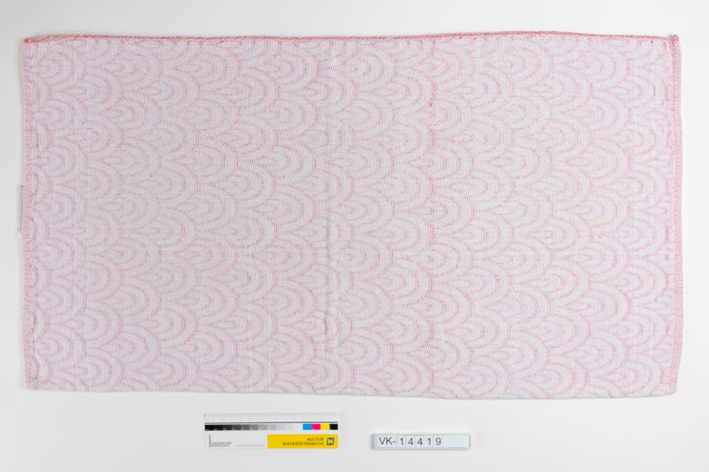 Weißes Frotteehandtuch mit rotem Schuppenmuster und einer weißen Aufhängeschlaufe.