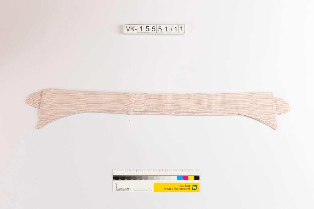 Hemdkragen (Spitzkragen) aus in Brauntönen fein gestreiftem Baumwollstoff. Der Kragen ist an der Innenseite mit Filzstift beschriftet: "IOGG".