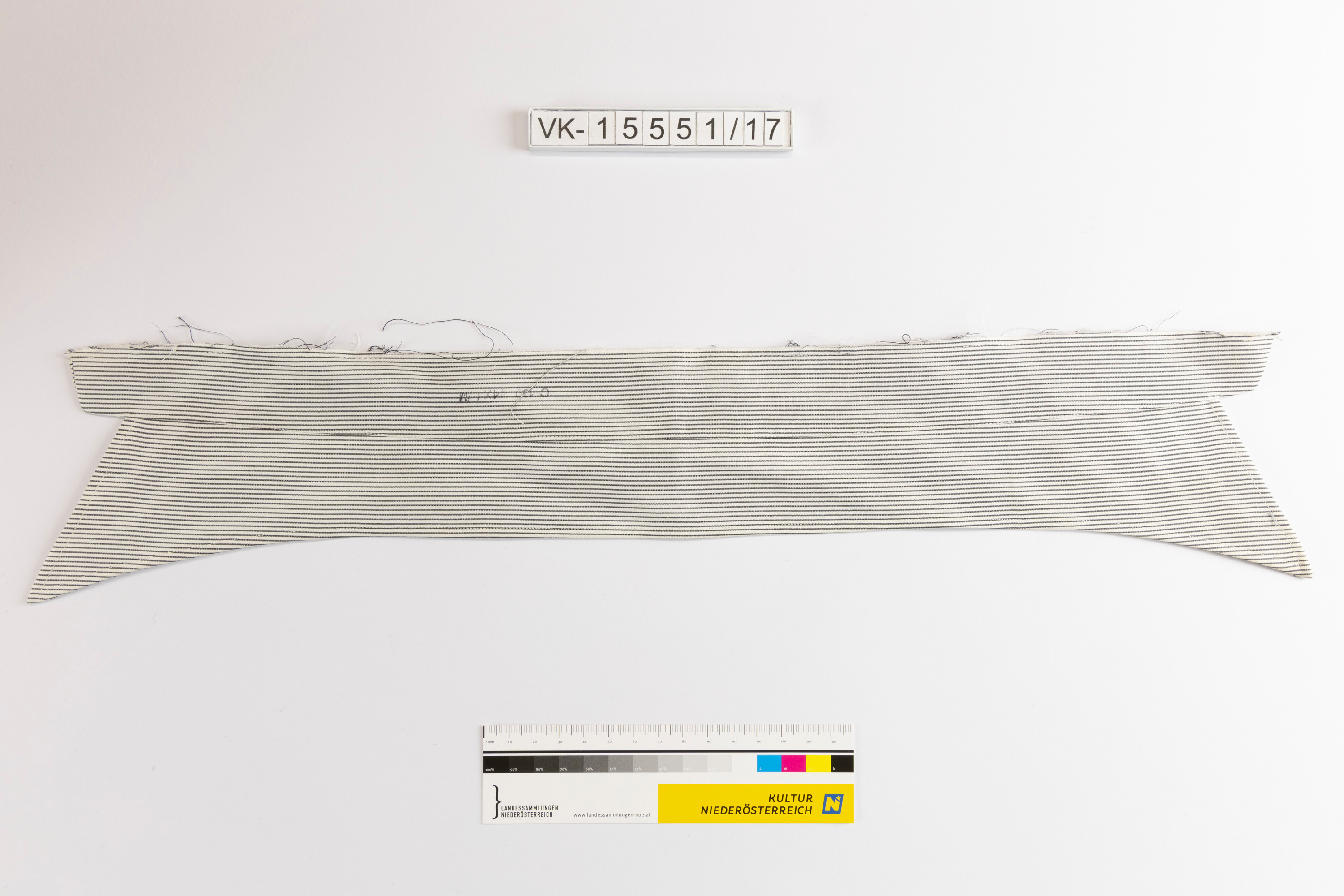 Hemdkragen (Spitzkragen) aus grau gestreiftem Baumwollstoff. Der Kragen ist an der Innenseite bedruckt: "C 139 44 X L/M".