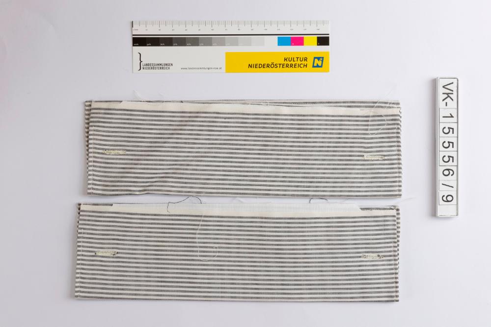 Ein Paar (zusammen gebunden) dunkelgrau gestreifte Manschetten. Die Manschetten sind neuwertig und haben an beiden Seiten Knopflöcher.