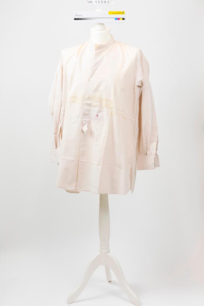 Hellrosa Herrenhemd (VK-15563a), langärmelig mit Manschetten, mit Knopfleiste bis zur Mitte und einem anknöpfbaren beigen Spitzkragen (VK-15563b). Das Hemd hat eine Monogrammstickerei: "AG".