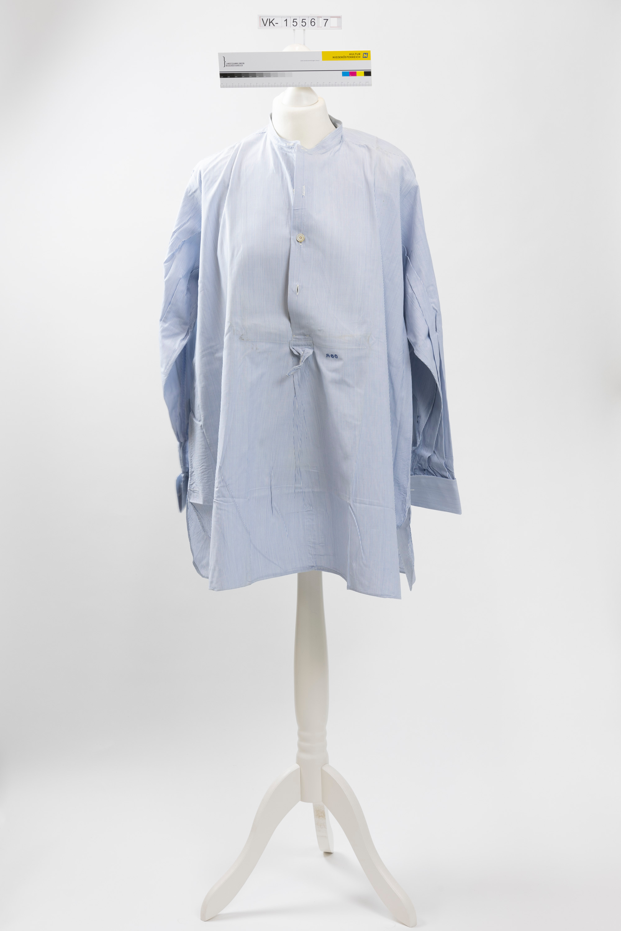 Blau gestreiftes Herrenhemd (VK-15567a), langärmelig mit Manschetten, mit Knopfleiste bis zur Mitte und einem anknöpfbaren Spitzkragen (VK-15567b). Das Hemd hat eine Monogrammstickerei: "AGG".