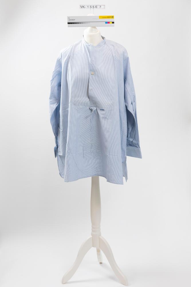 Blau gestreiftes Herrenhemd (VK-15567a), langärmelig mit Manschetten, mit Knopfleiste bis zur Mitte und einem anknöpfbaren Spitzkragen (VK-15567b). Das Hemd hat eine Monogrammstickerei: "AGG".