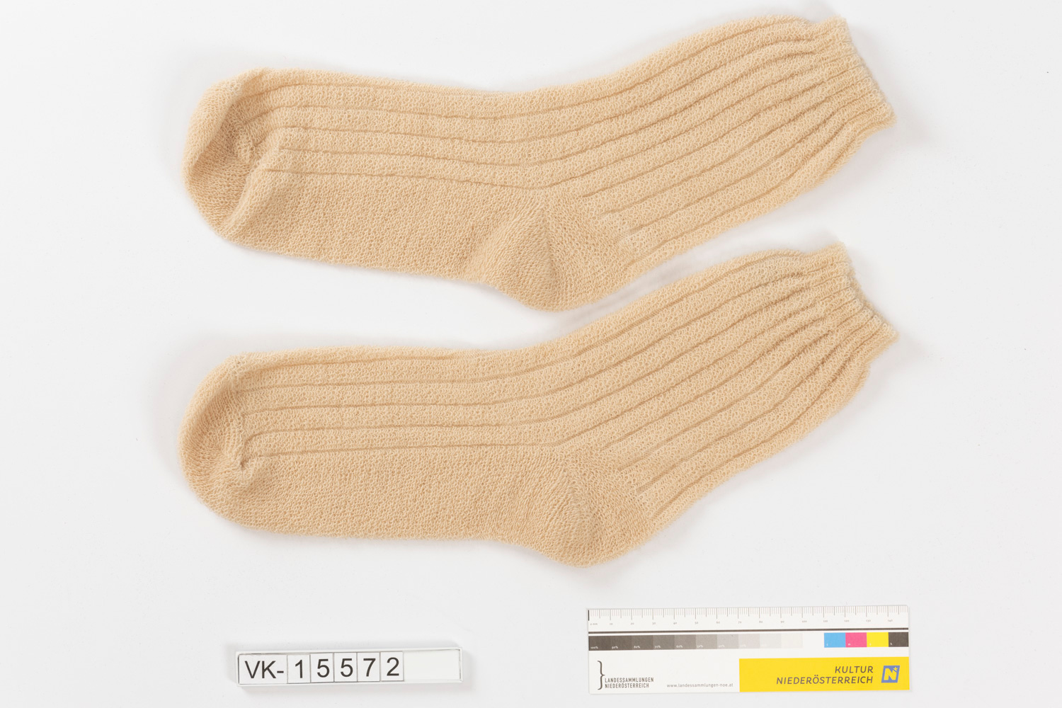 Ein Paar rosa Wollsocken (a, b) mit eingearbeiteten Längsstreifen.