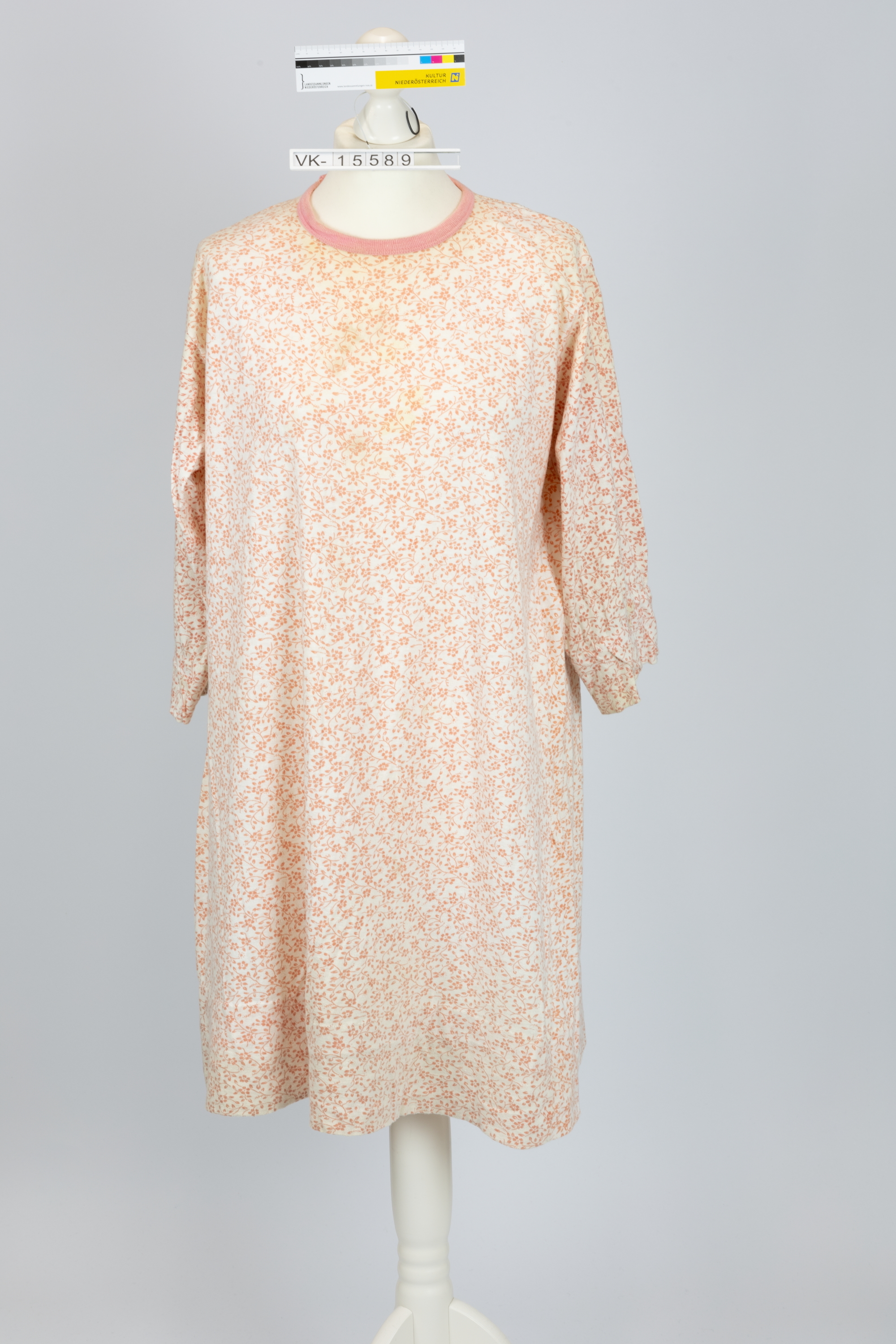 Weißes langärmeliges Nachthemd mit rotem Blumenmuster und einem rosa gefassten Halsausschnitt.