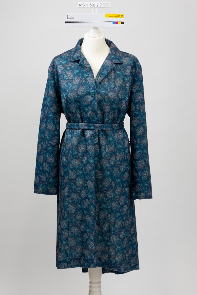 Langärmeliges Kleid mit Kragen, Gürtel und Knopfleiste im Brustbereich. Der Stoff ist in blauen und rotbraunen Farbtönen ornamental gemustert; Größe 50.