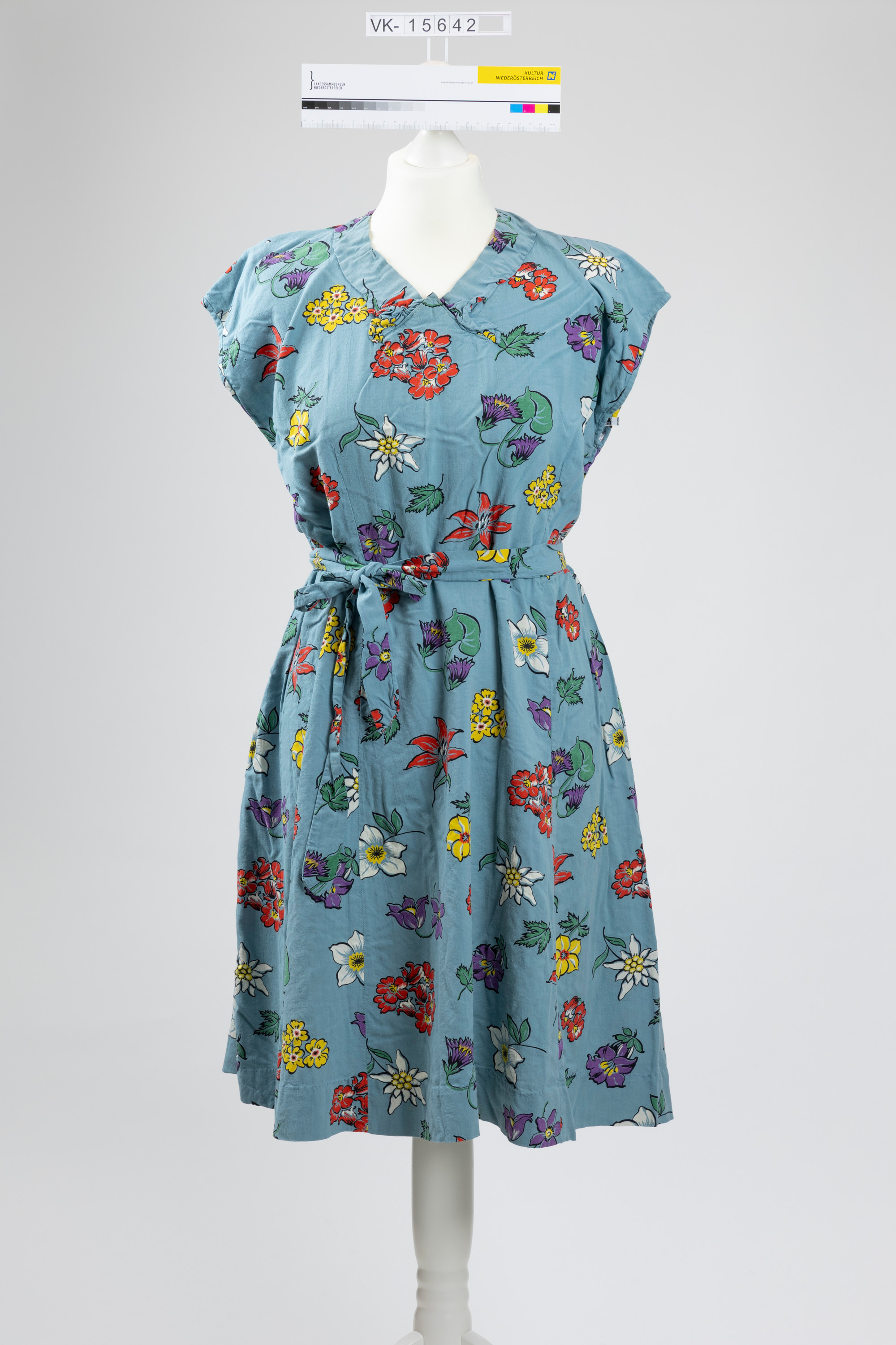 Ärmelloses Kleid mit Gürtel und Rundhalsausschnitt. Der blaue Stoff ist mit verschiedenen mehrfärbig dargestellten Blüten (Enzian, Narzissen, Edelweiß, etc.) bedruckt.