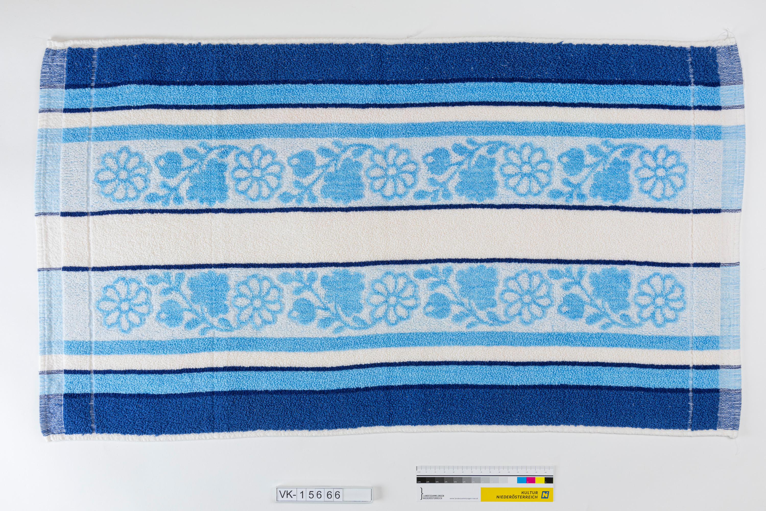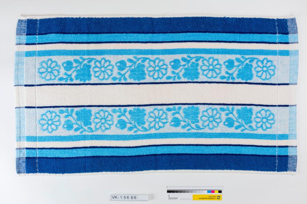 Frotteehandtuch mit Streifen in weiß und verschiedenen Blautönen, im mittleren Bereich zwei florale Musterstreifen. Das Handtuch hat ein Etikett mit Waschanweisungen und "MADE IN AUSTRIA".