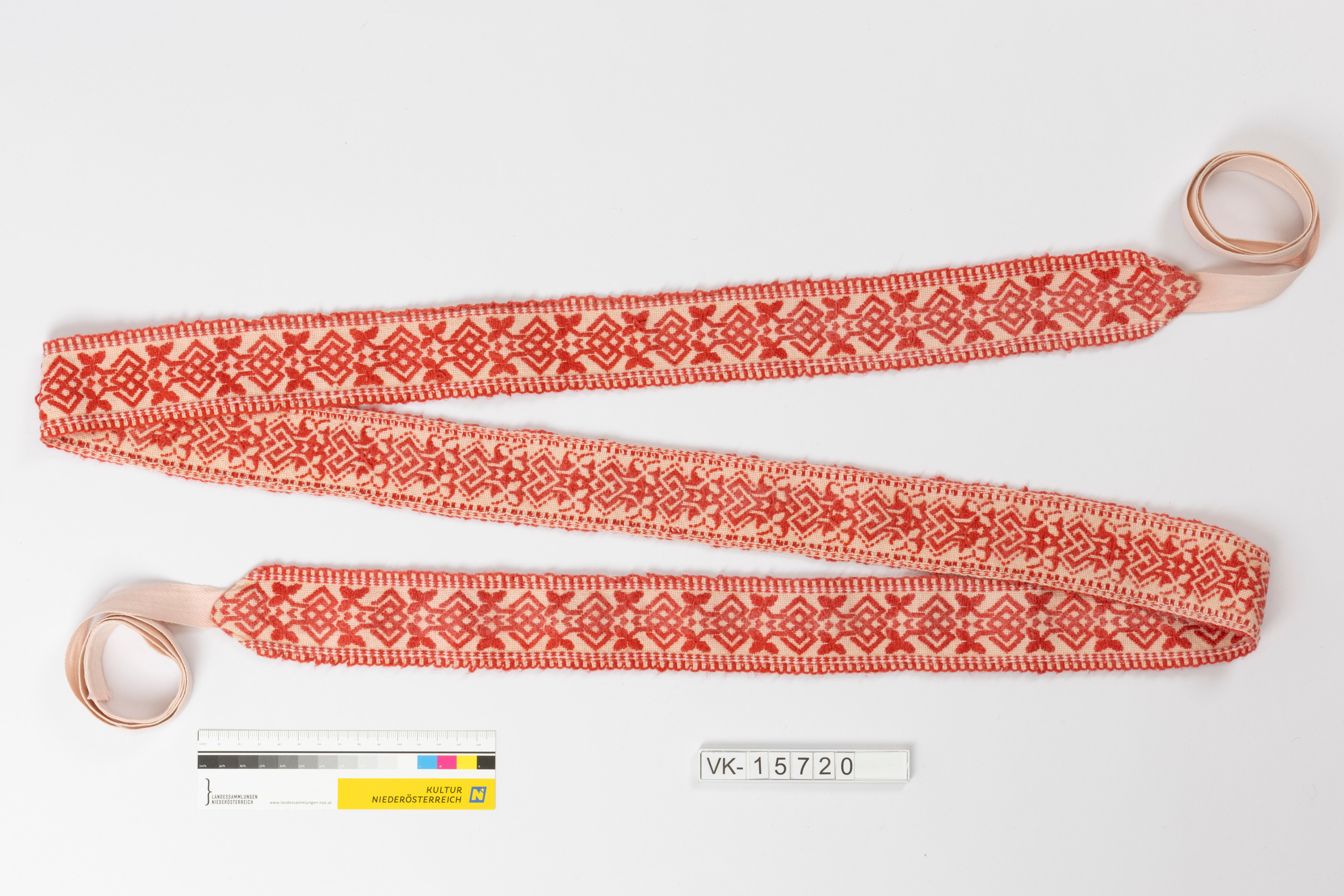 Beiges Wickelband aus Aidastoff mit weißen Köperbändern zum Binden, durchgehend mit rotem Garn in einem geometrischen Muster mit Blattelementen bestickt.