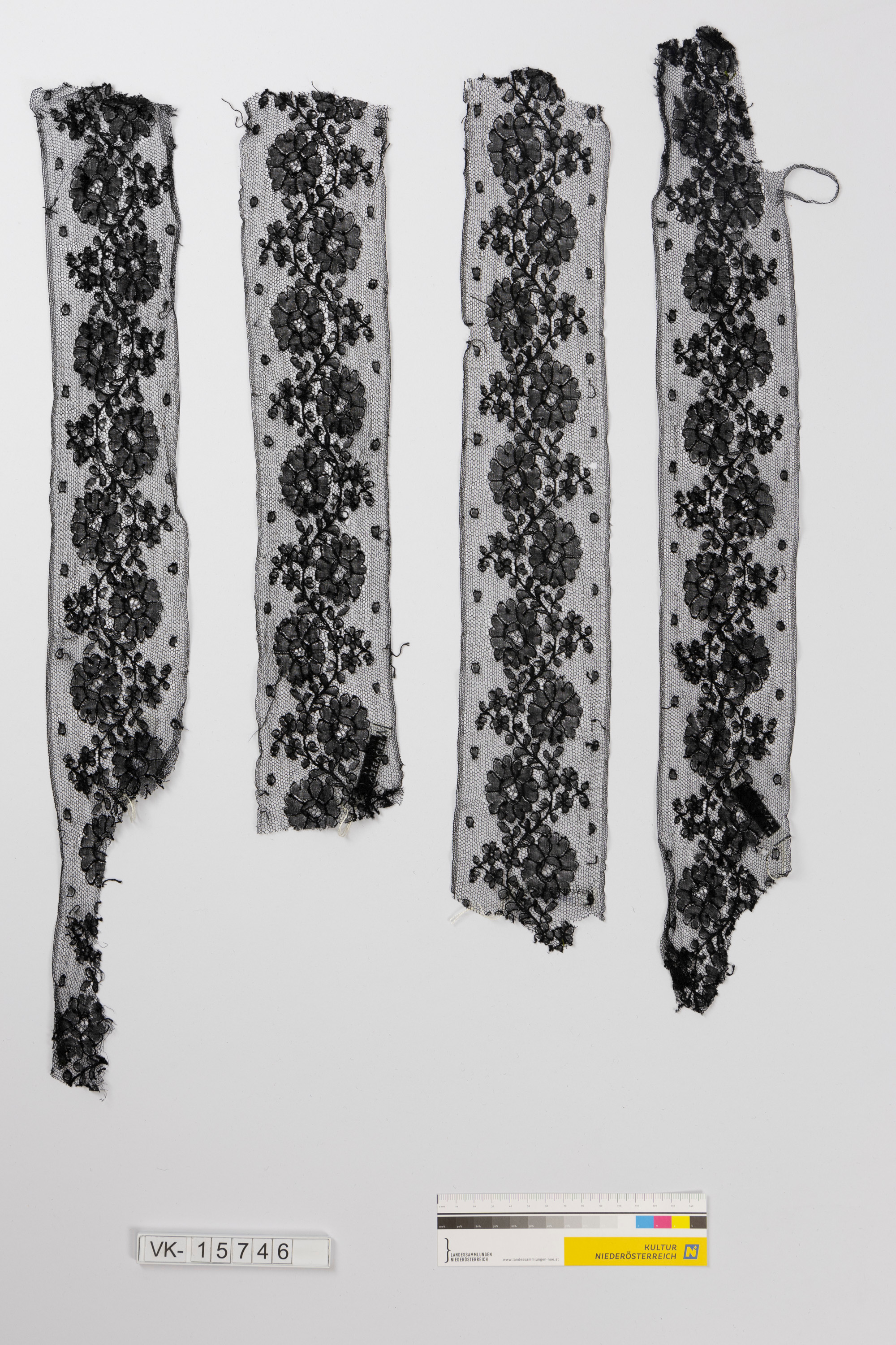 Vier Stücke (a-d) eines schwarzes Tüllspitzenbandes mit Blüten- und Pünktchenmuster.