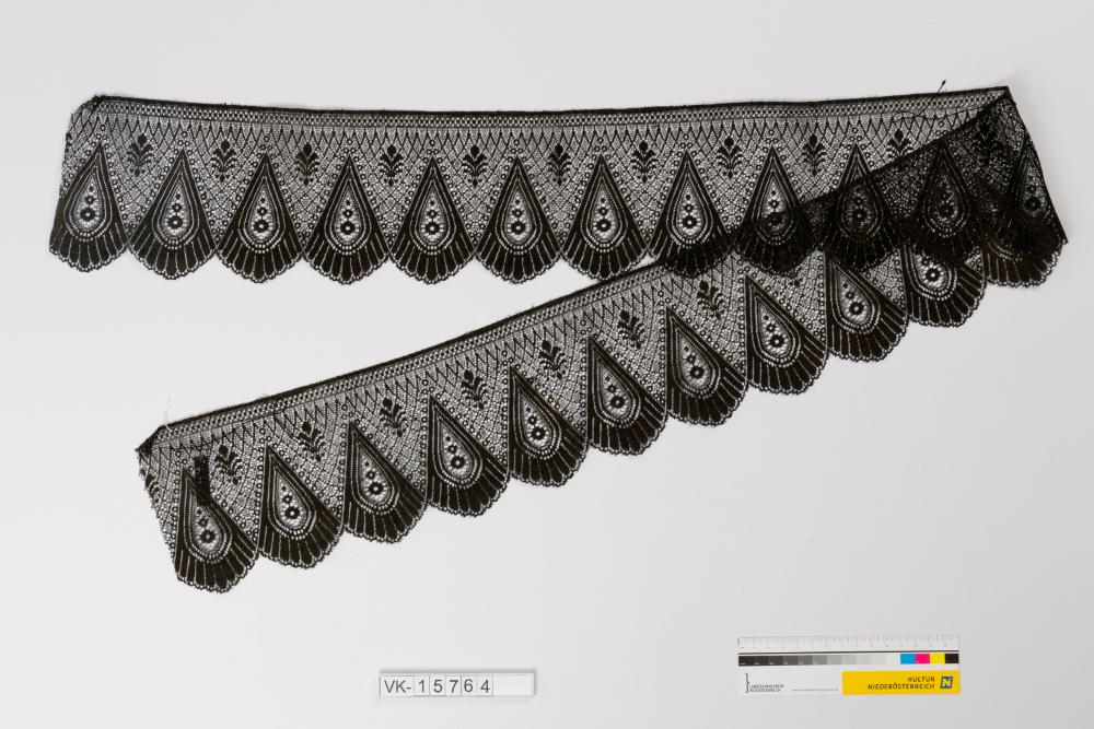 Breites schwarzes Spitzenband mit ornamental-floralem Dekor und zur Bogenkante hin verbreiterten, annähernd dreieckigen Elementen.
