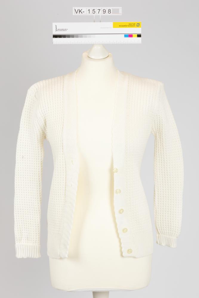 Weiße Wollweste mit Waffelmuster und V-Ausschnitt.