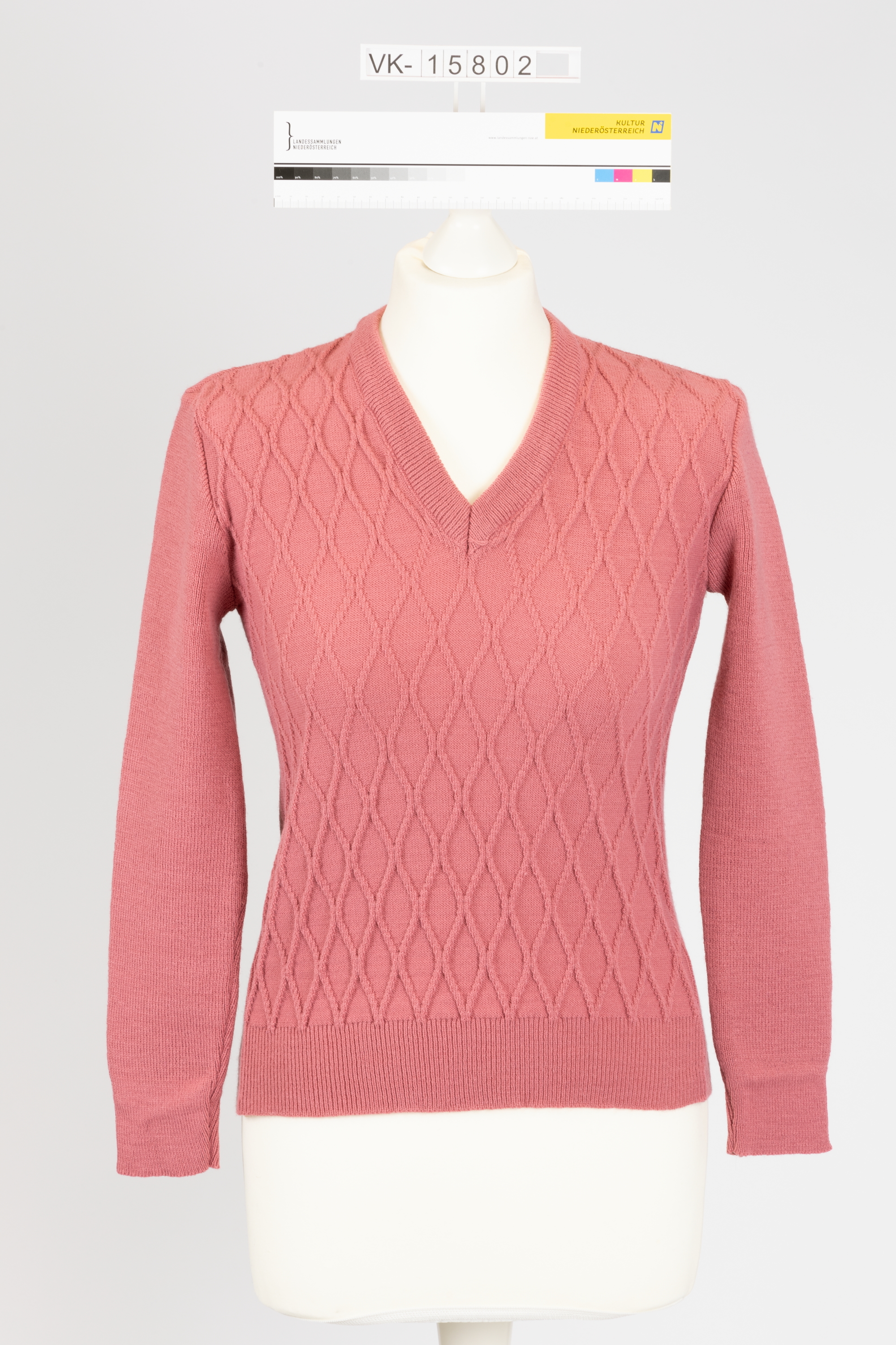 Roter Pullover mit einem Rautenmuster an der Vorderseite.