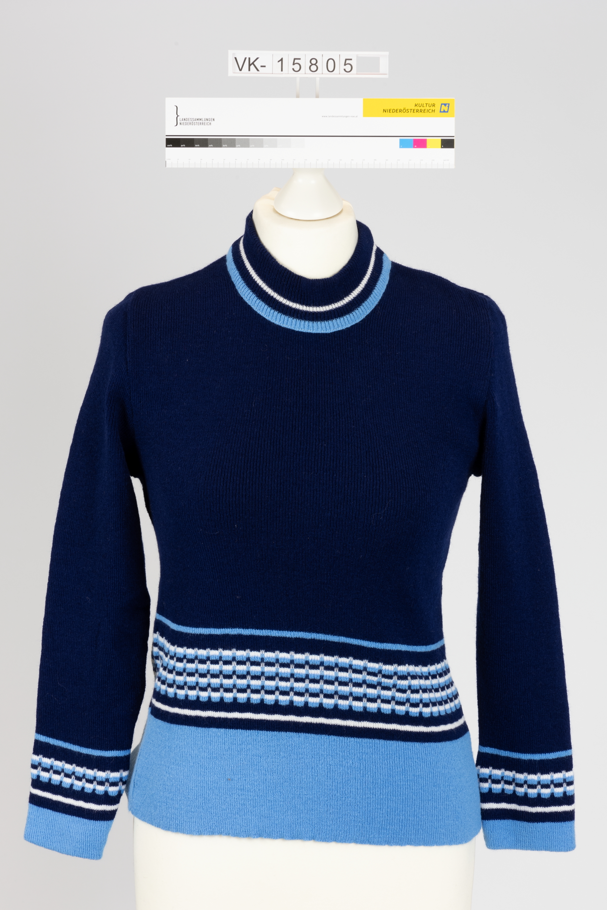 Dunkel- und hellblauer Rundhalspullover mit Streifenelementen im unteren Bereich. Beschriftung auf dem Etikett: "Schoeller Acryl pflegeleicht".