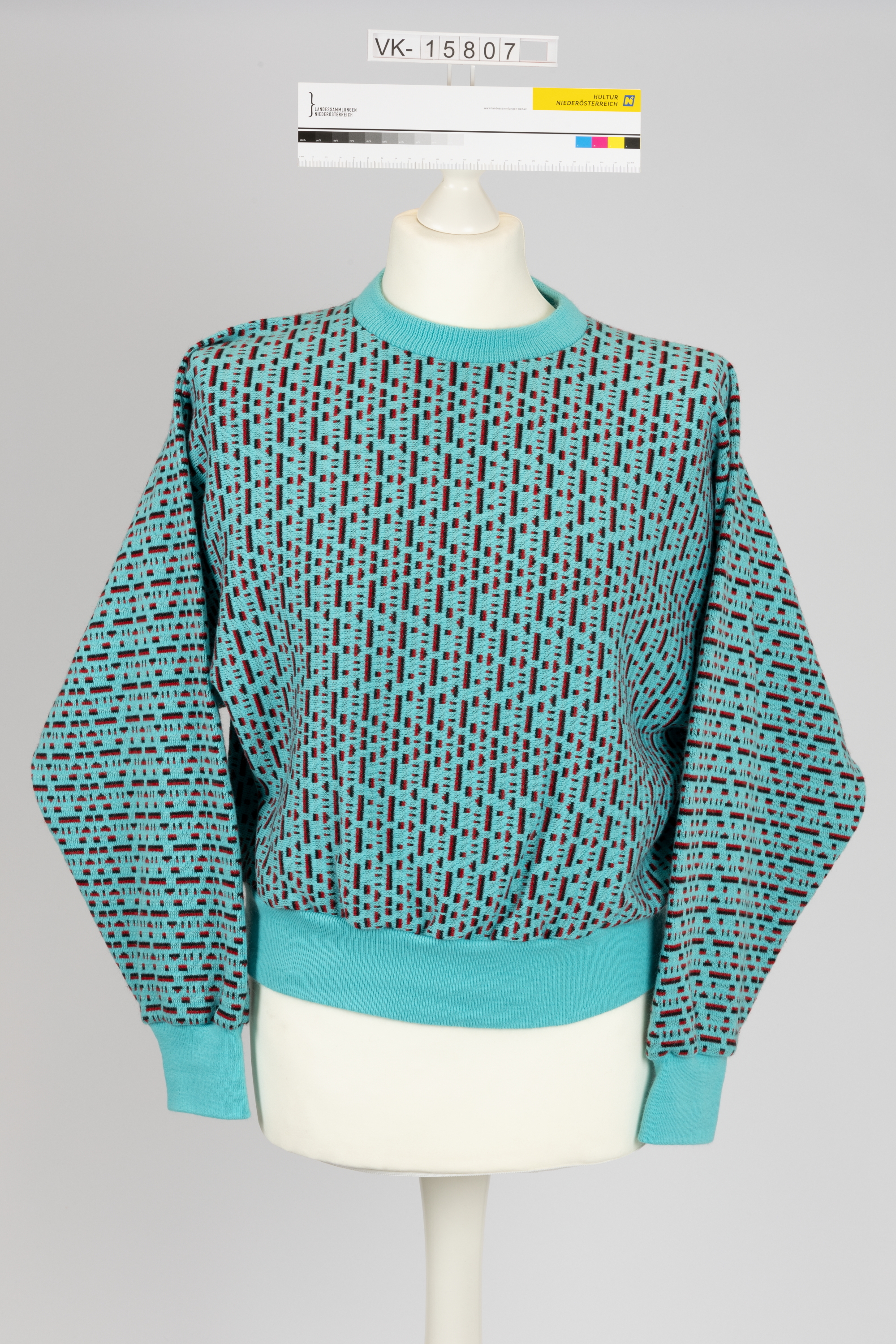 Rundhalspullover mit türkiser Grundfarbe und schwarz-rotem Muster. Die Ärmel sind nicht angesetzt und sehr breit.