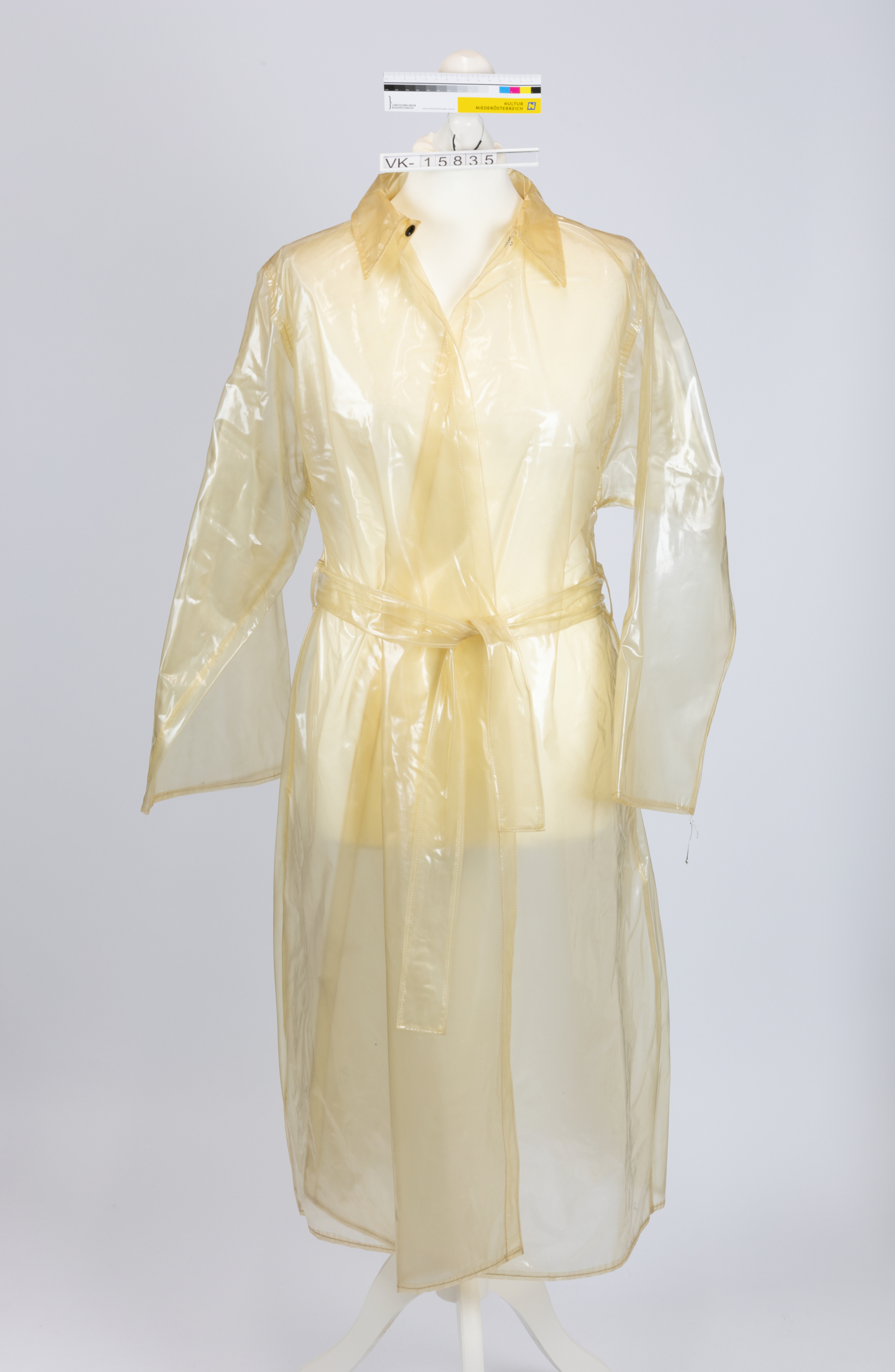 Transparent-bräunlicher Regenmantel mit einem Druckknopf.