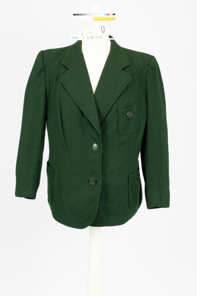 Dunkelgrüne Wolljacke für Damen mit dunkelgrünem Futter und grünen marmorierten Knöpfen. In der Jacke befindet sich ein Etikett: "467312".