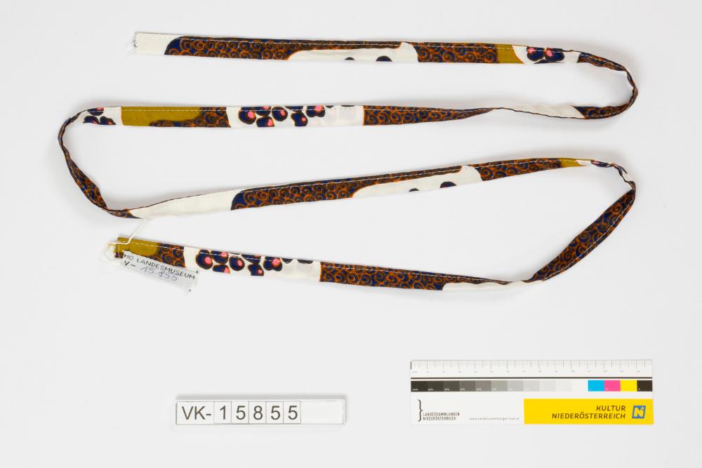 Schmaler Stoffgürtel aus in Brauntönen sowie in rot und blau gemusterten Stoff, ohne Verschluss.