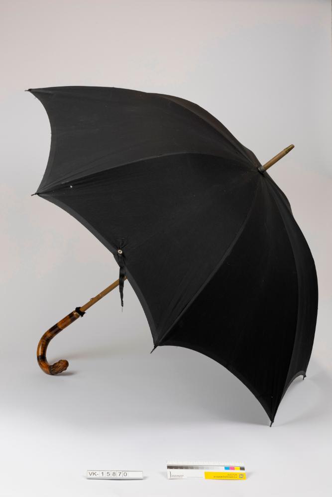 Schwarz bespannter Regenschirm mit geschwungenem Holzgriff, dessen Ende beschnitzt ist. Das Gestänge ist aus Metall, der Stock ist aus Holz und hat an der Spitze eine Metallzwinge.