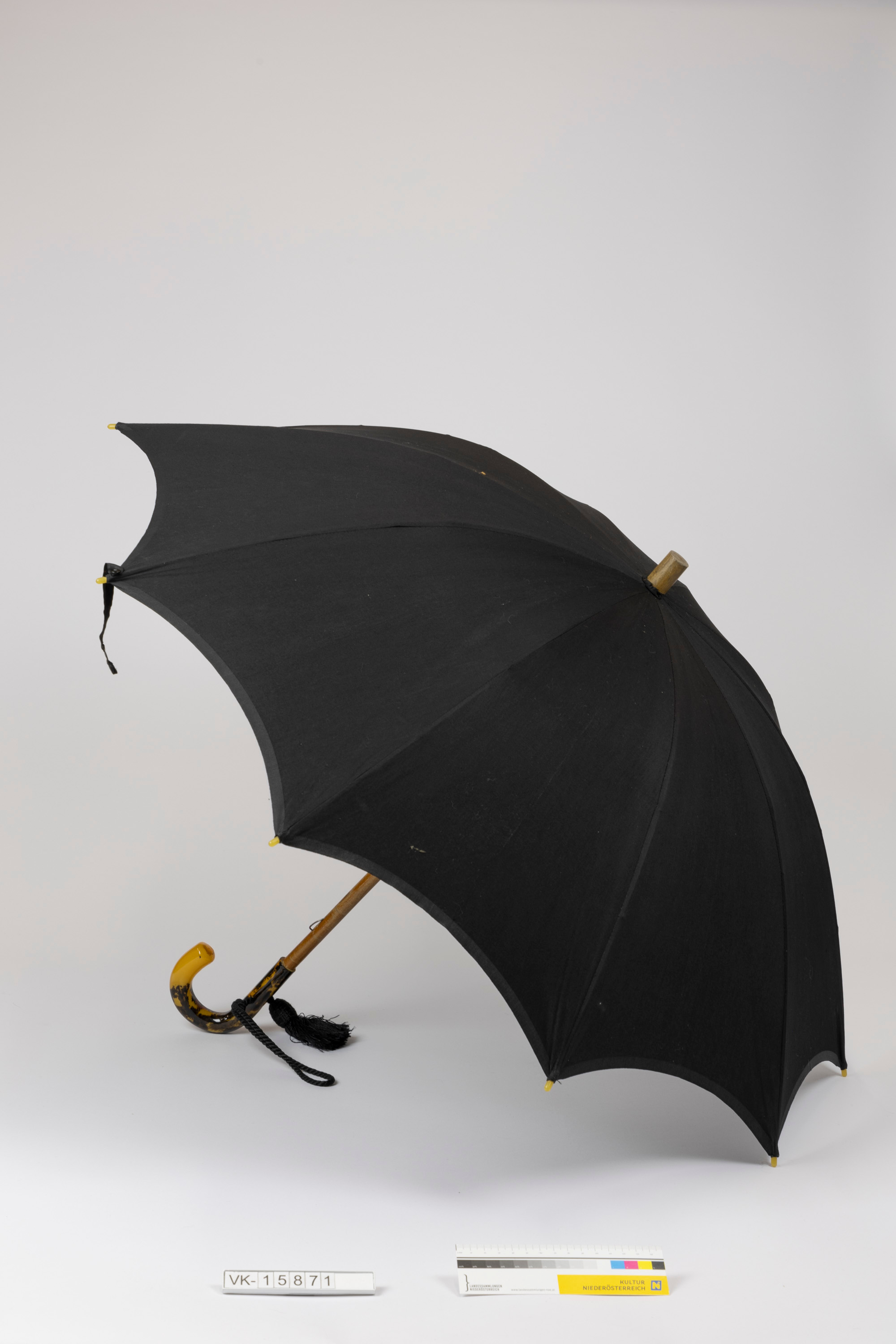 Schwarz bespannter Regenschirm mit geschwungenem gelb-braunen Griff, gelben Ösen und einer gelben Zwinge. Am Griff befindet sich eine schwarze Posamentriekordel mit einer Quaste.