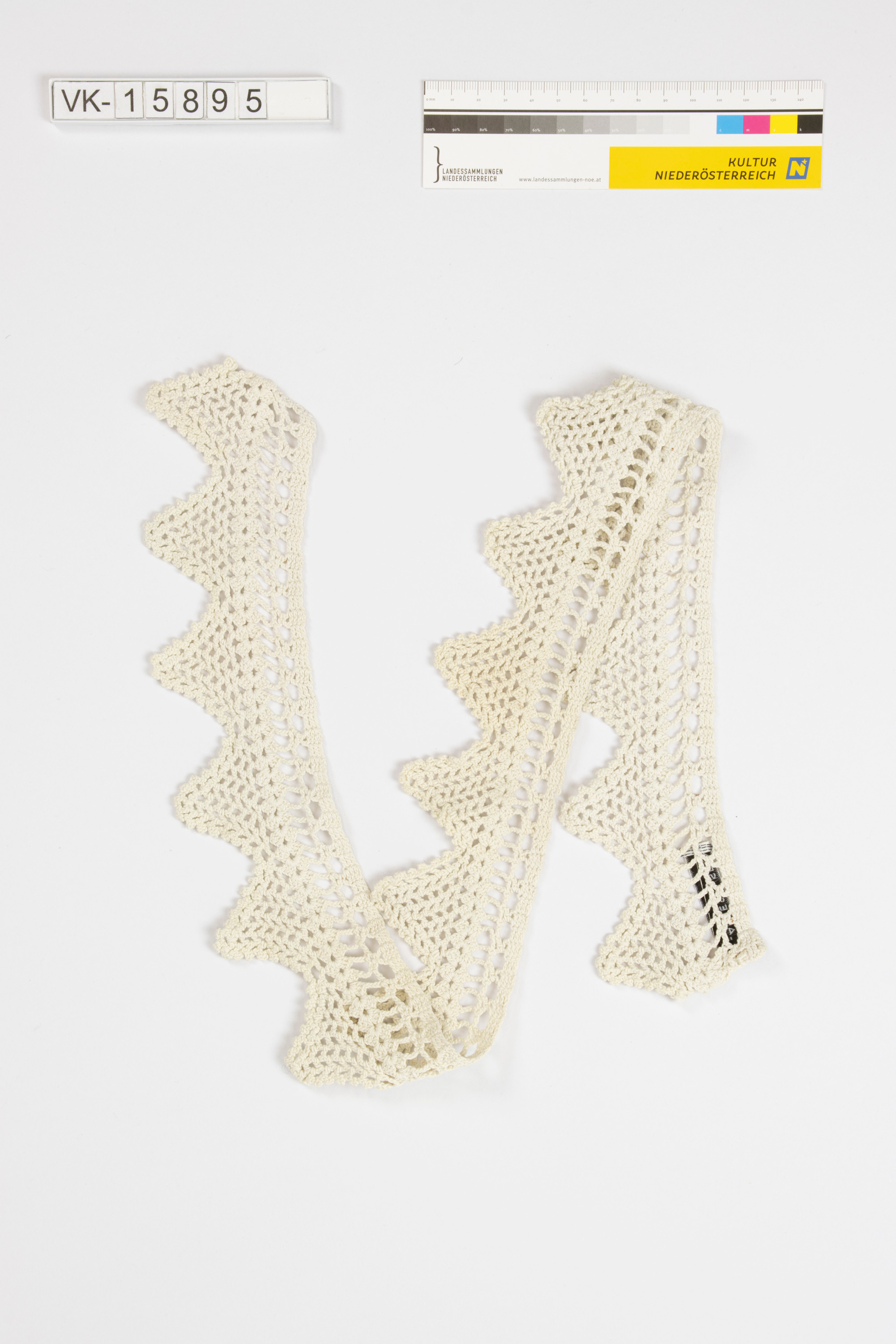 Weiße gezackte Häkelspitze, möglicherweise für einen Kragen.