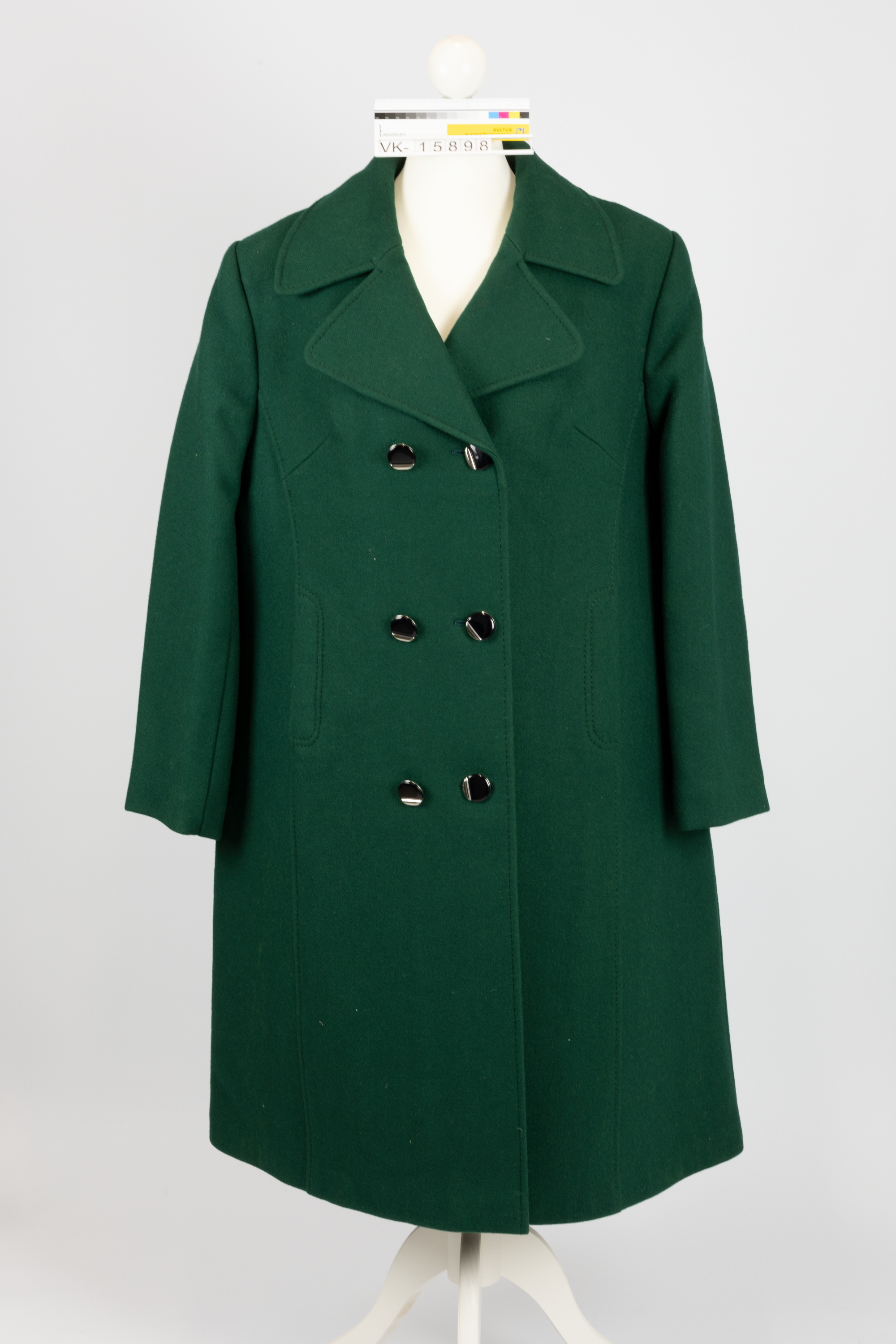 Grüner Damenwollmantel mit zwei Knopfreihen und braunem Satinfutter. In dem Mantel befindet sich ein Etikett: "EXCLUSIVE LG MADE IN AUSTRIA 80% SCHURWOLLE 20% POLYAMID".