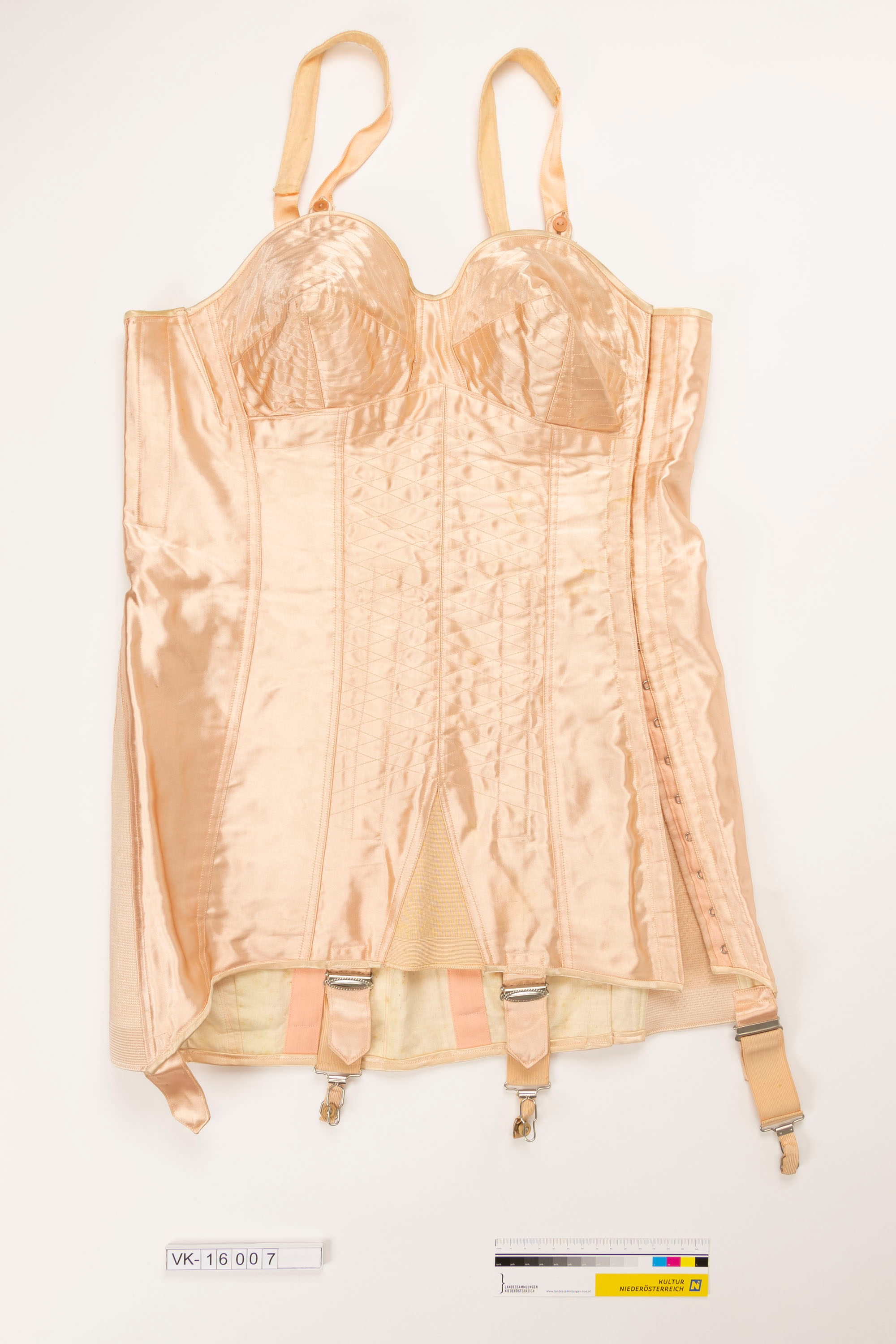 Lachsrosa Satinkorsett mit Körbchen, passepoilierten Kanten, geknöpften Trägern und Strumpfhalterriemen.