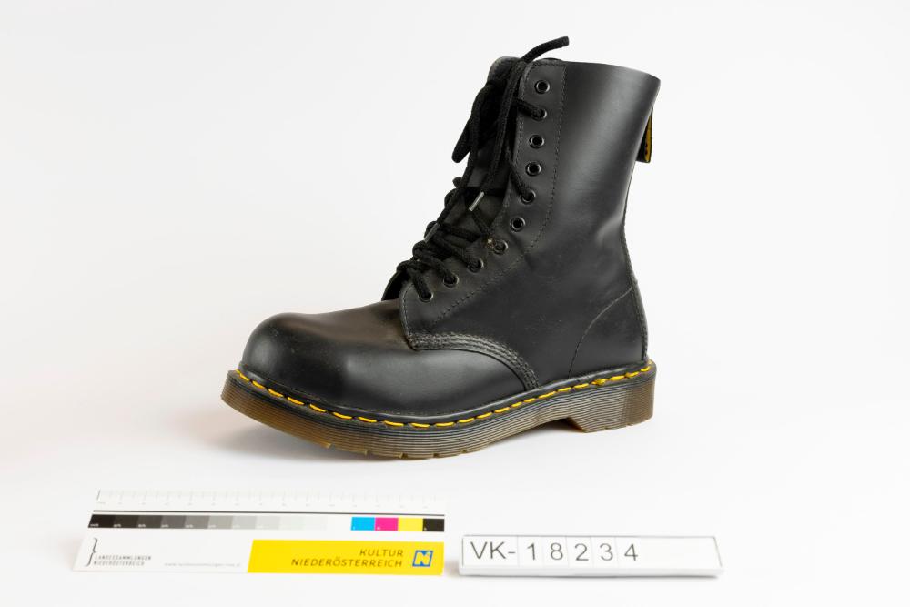 Schwarzer linker Lederschnürstiefel (Größe 6) mit Zehnlochschnürung und brauner Gummisohle mit gelber Naht. Auf der Sohle befindet sich die Herstellermarke: "DR. MARTENS". Der Stiefel ist neu. Es handelt sich hierbei um die Version mit eingearbeiteter Stahlkappe im Zehenbereich.