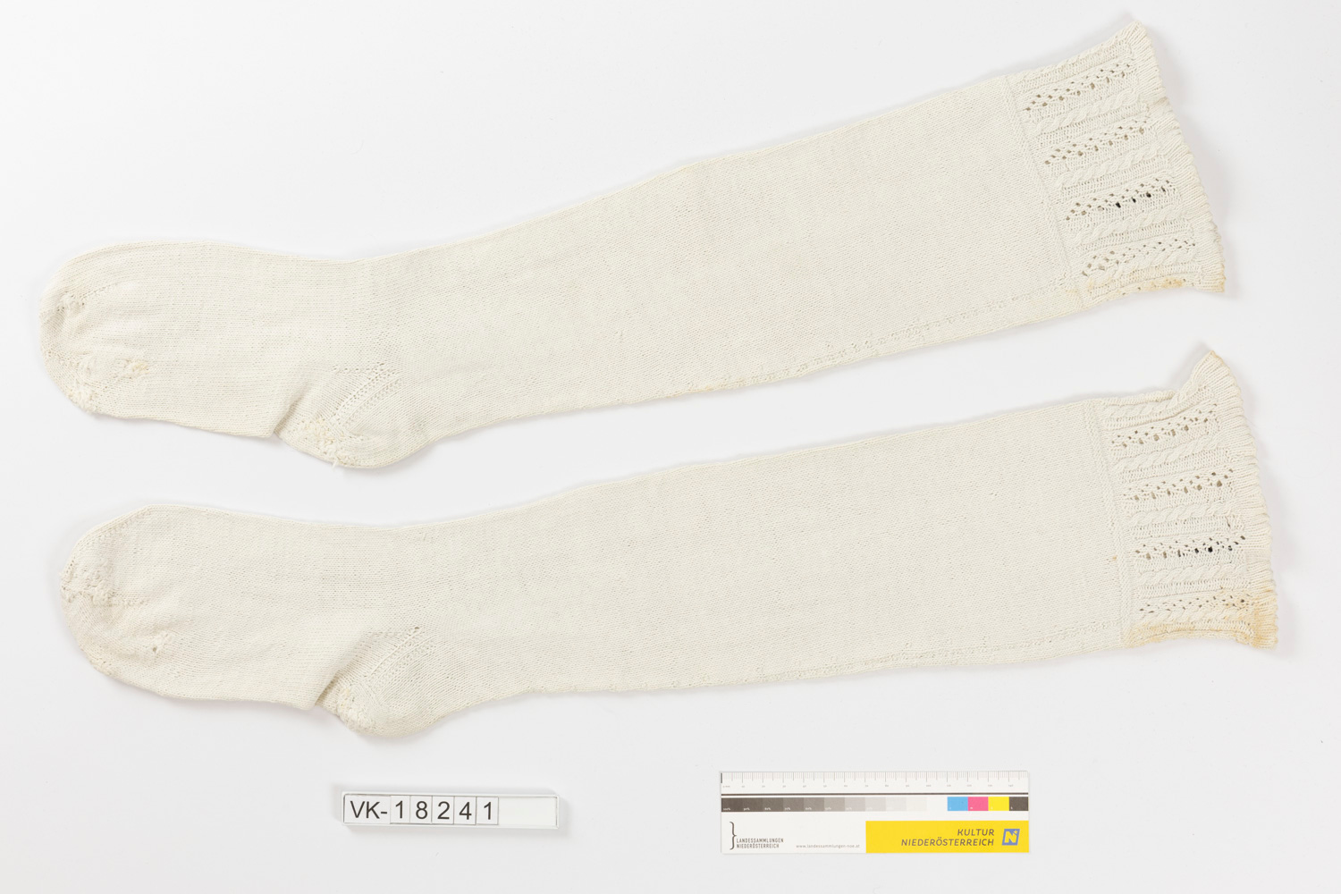 Ein Paar weiße Baumwollstutzen (a, b) mit durchbrochen gemusterten Bündchen.