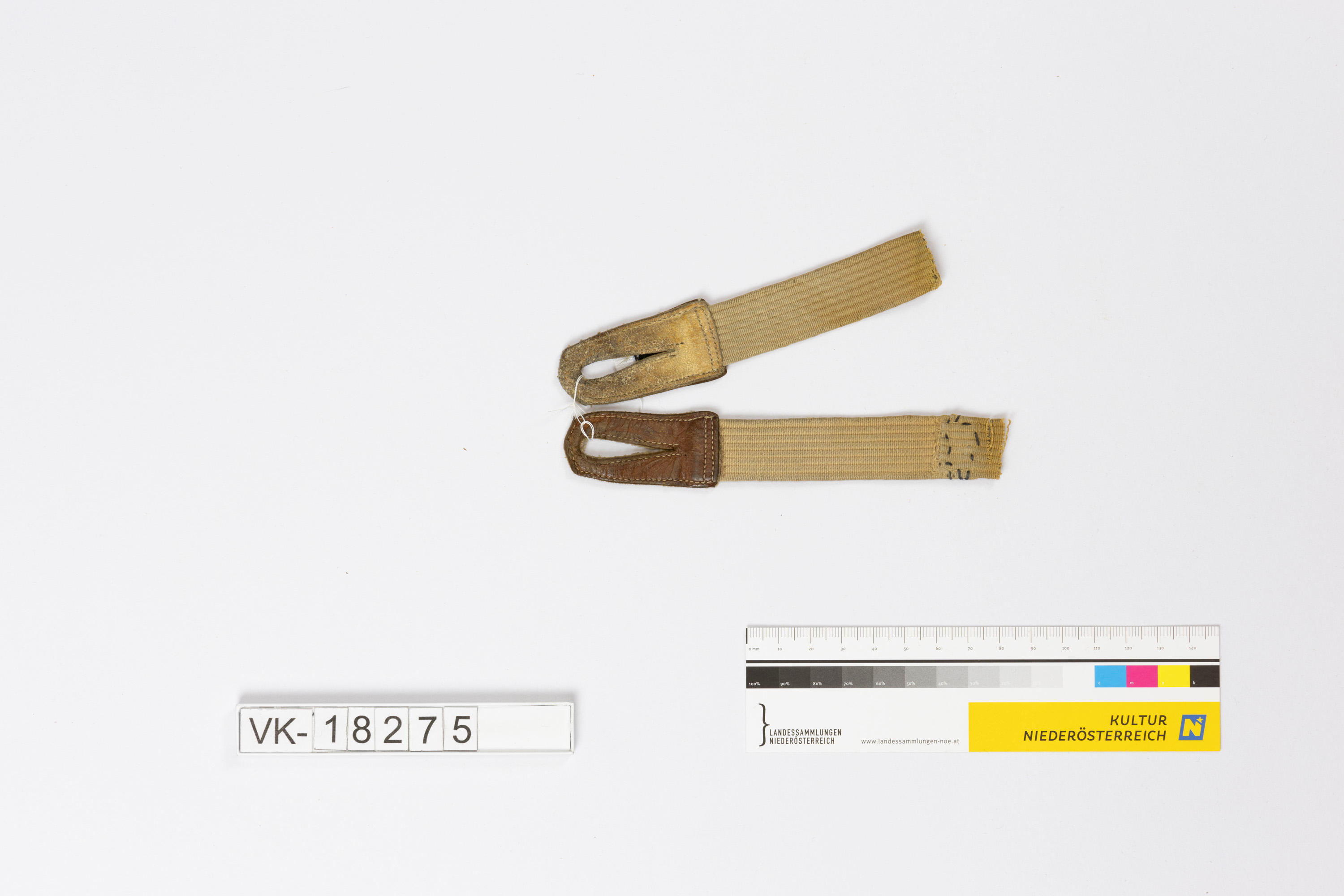 Beiges Gummiband mit zwei Lederschlaufen an den Enden.