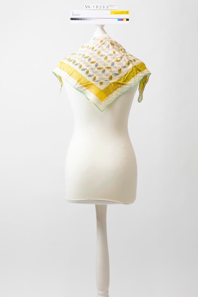 Weißes Seidentuch mit grünem Rand und einem Muster aus grünen, blauen und nicht eingefärbten Schirmen.