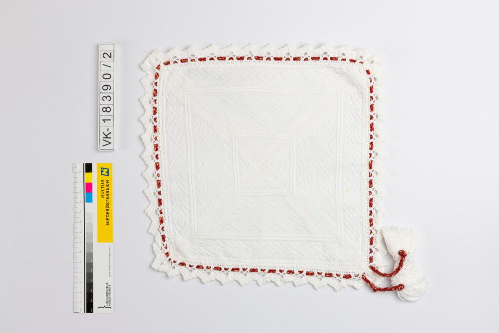 Quadratisches Deckchen aus geometrisch gemustertem Baumwollpikeestoff, eingefasst mit einer gezackten Häkelspitze, in die ein rot-weiß meliertes Bändchen eingezogen ist, das mit zwei weißen Quasten endet.