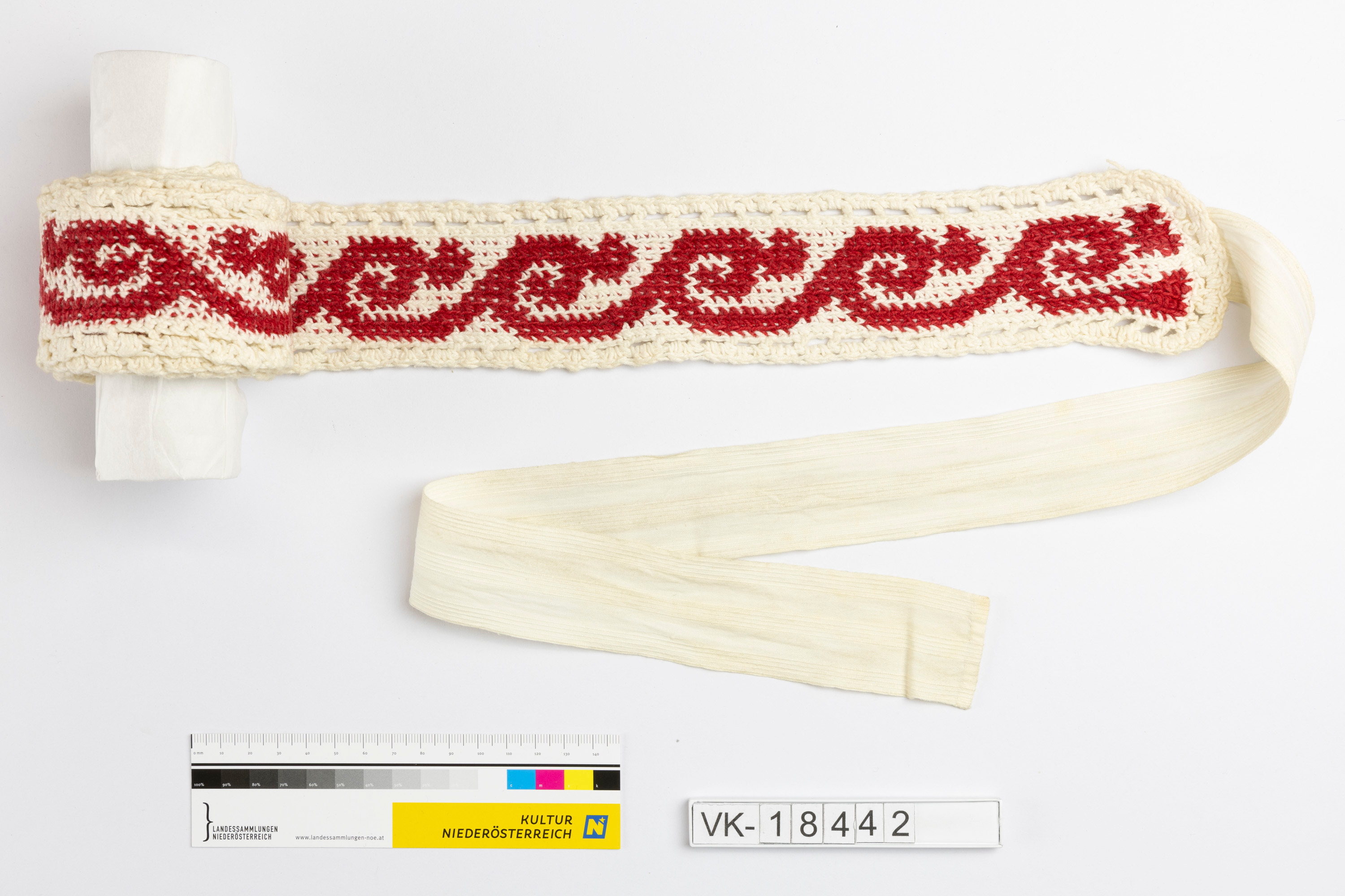 Gestricktes Wiegenband mit Häkelbortenabschluss, weiß mit roter Girlande. Das Band hat zwei weiße Leinenbänder zum Binden.