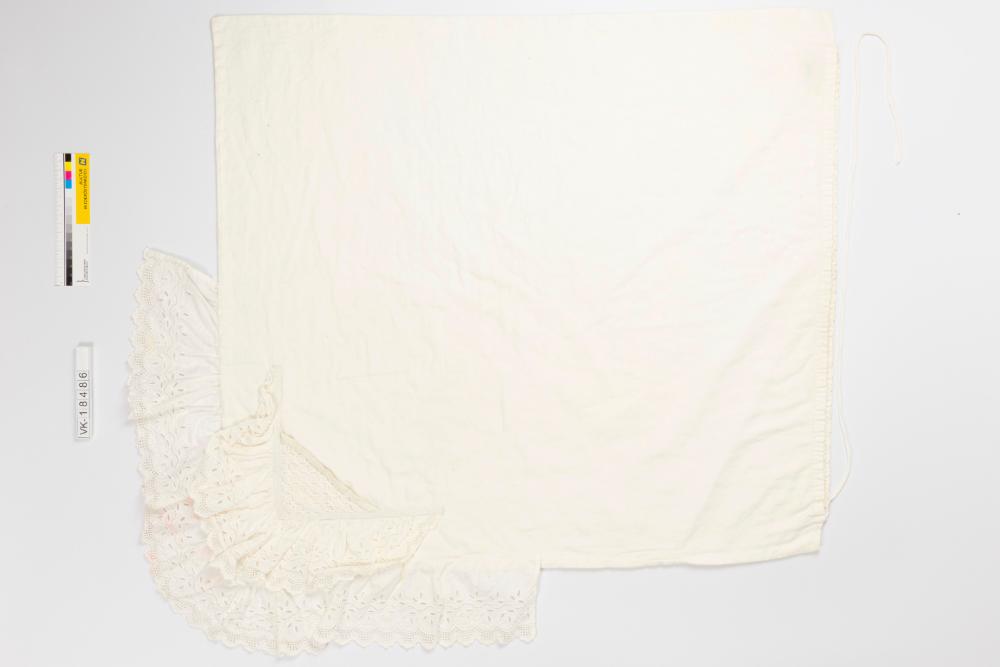 Annähernd quadratische Babydecke aus Baumwolle mit eingearbeitetem Zugbändchen, an einem Eck in zwei Lagen mit teilweise gefältelter Wäschespitze besetzt.