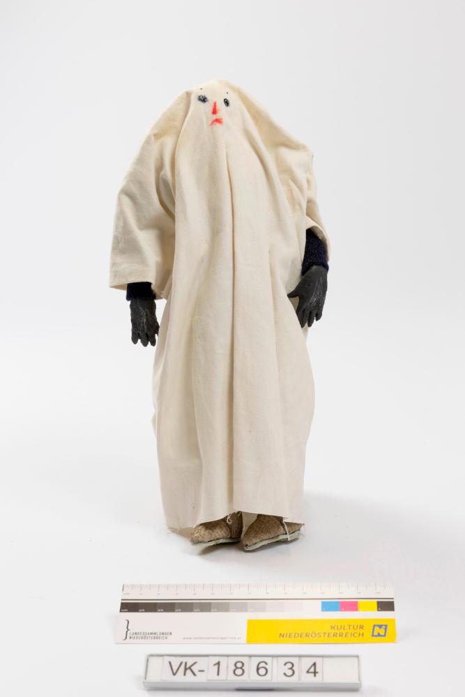 Umzugsfigur (Geist bzw. Gespenst) mit weißem Umhang über dem Kopf (mit aufgemaltem Gesicht), schwarzen Handschuhen und grauen Schuhen.