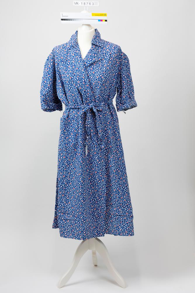Kurzärmeliges Kleid (VK-18763a) mit Kragen, vorne offen und mit einem beiliegenden Gürtel (VK-18763b) zu verschließen.