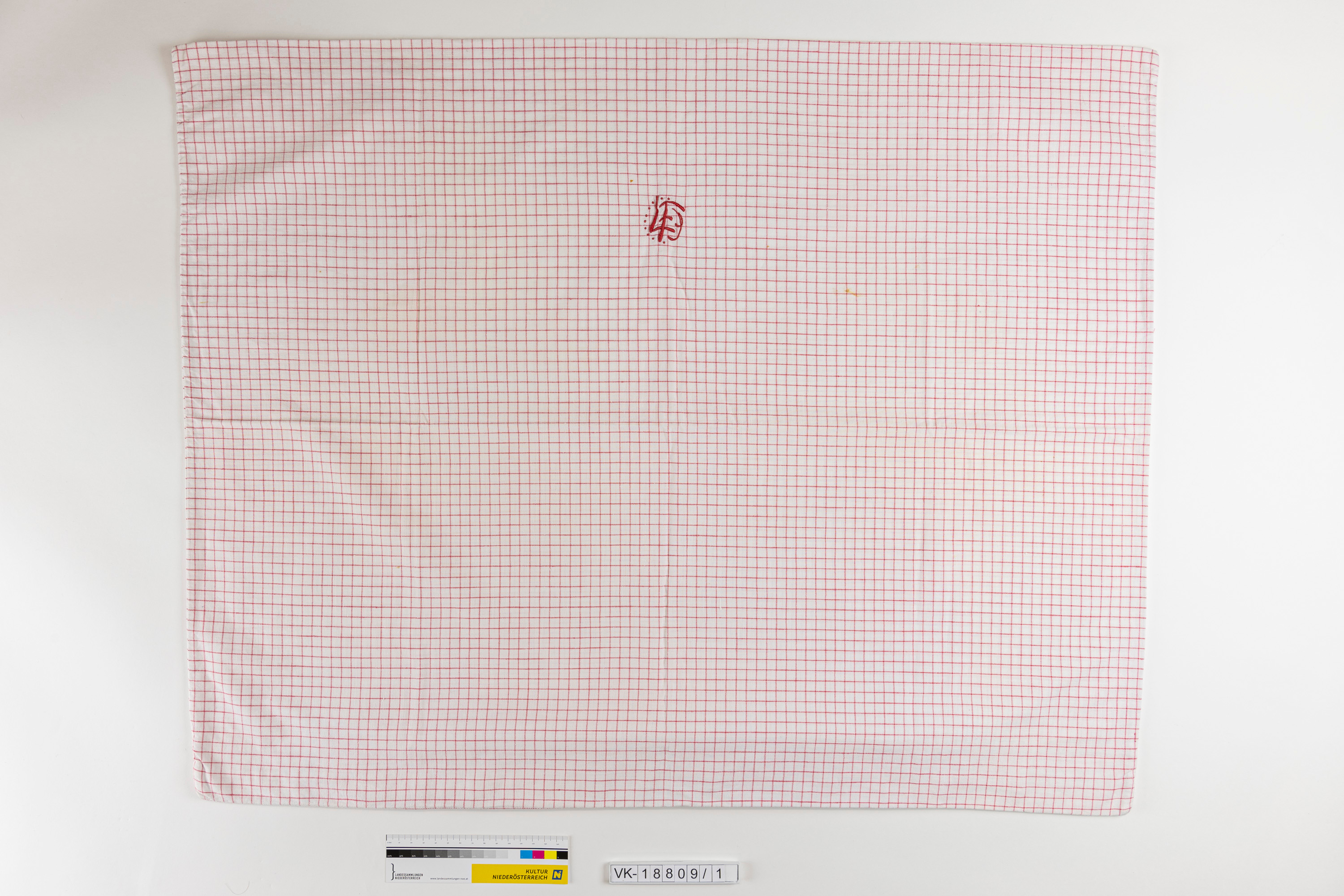 Polsterüberzug aus weißem Stoff mit rotem Karomuster, geknöpft, Monogrammstickerei mit rotem Garn: "FL".