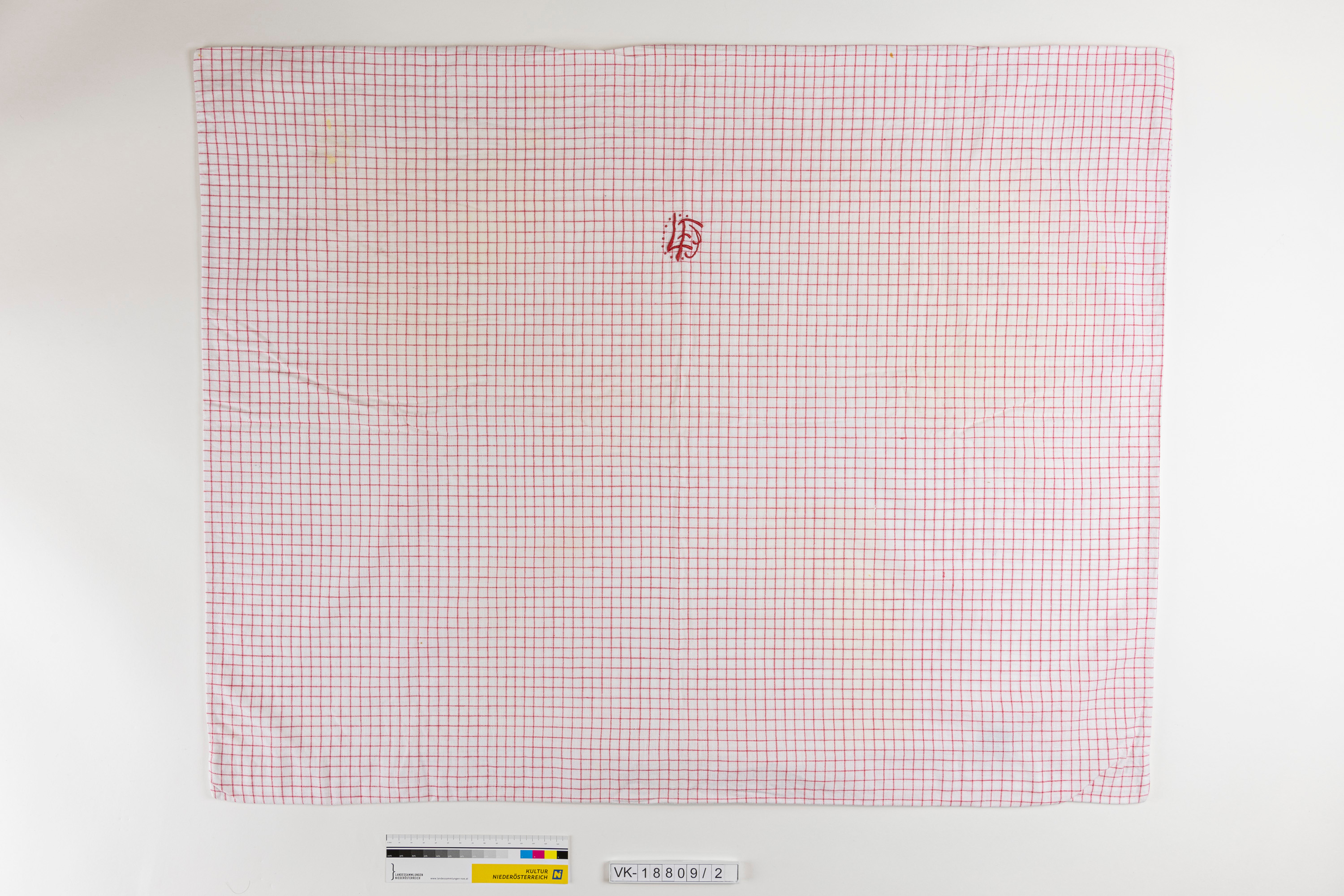 Polsterüberzug aus weißem Stoff mit rotem Karomuster, geknöpft, Monogrammstickerei mit rotem Garn: "FL".