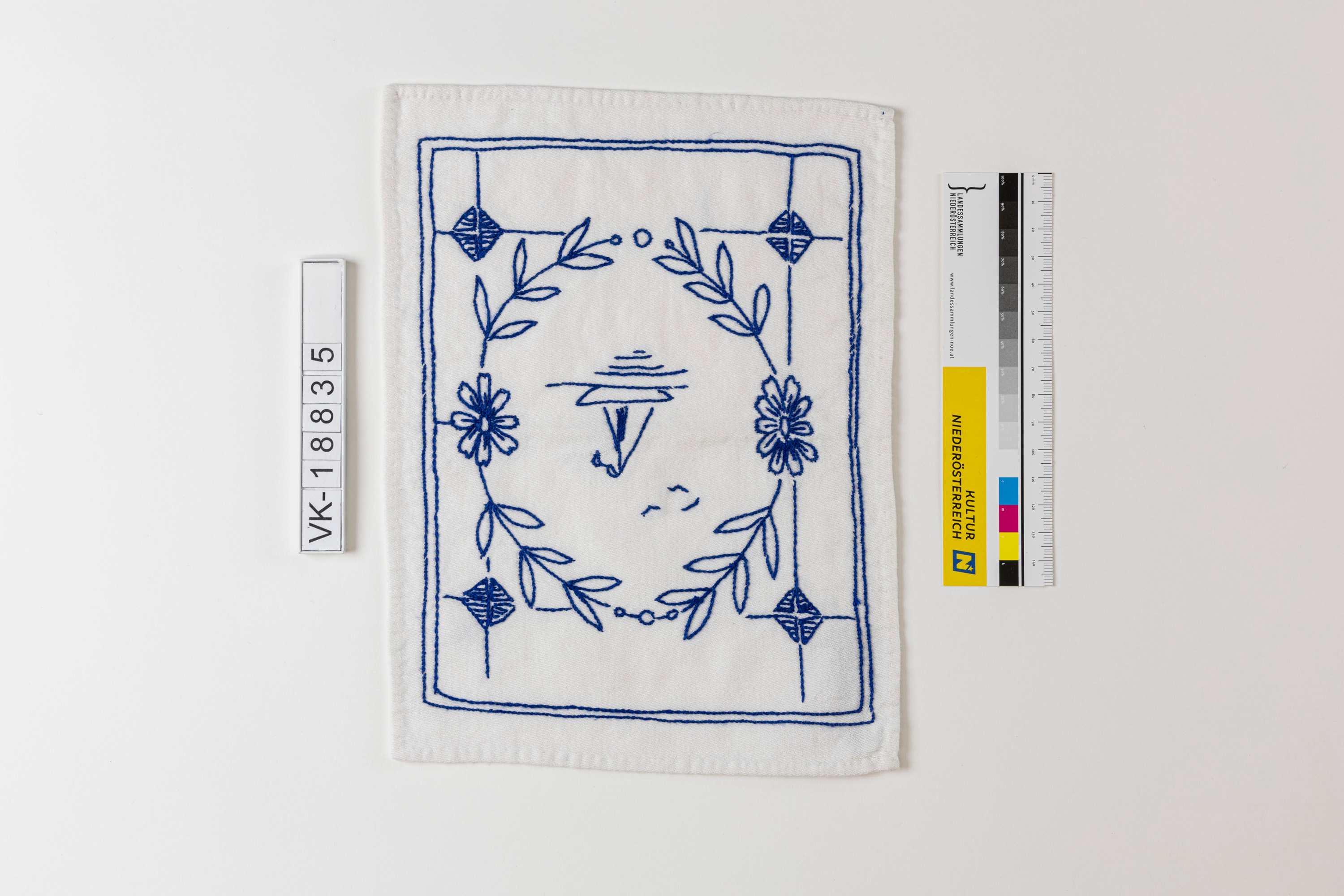 Rechteckiges weißes Leinendeckchen, mit blauem Garn bestickt: Ein Segelboot in einem floralen Rahmen.