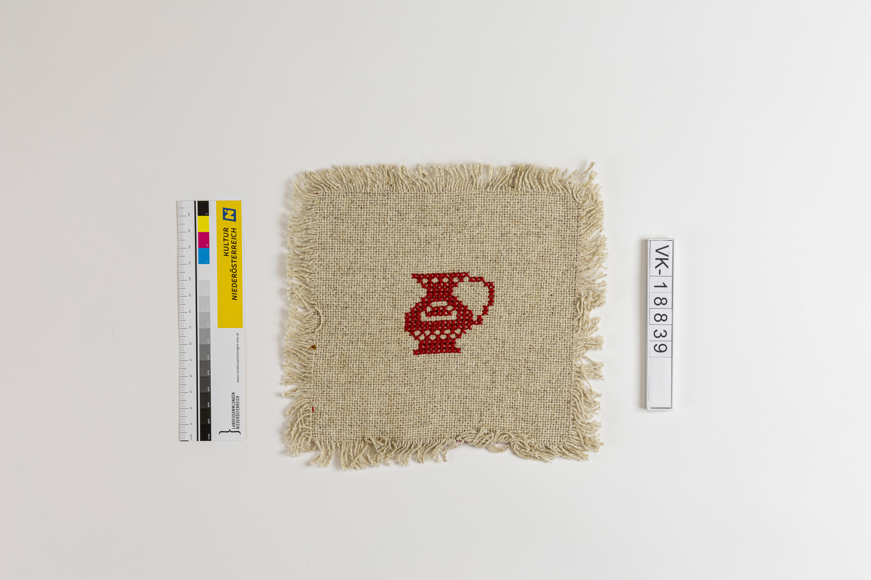 Annähernd quadratisches beiges Leinendeckchen mit Fransenrand; eine Seite ist im Kreuzstich mit einem Krugmotiv in rot bestickt, die andere Seite ist vollflächig mit einem roten Stoff versehen, der ein schwarzes und weißes stilisiertes Blütenmuster hat.