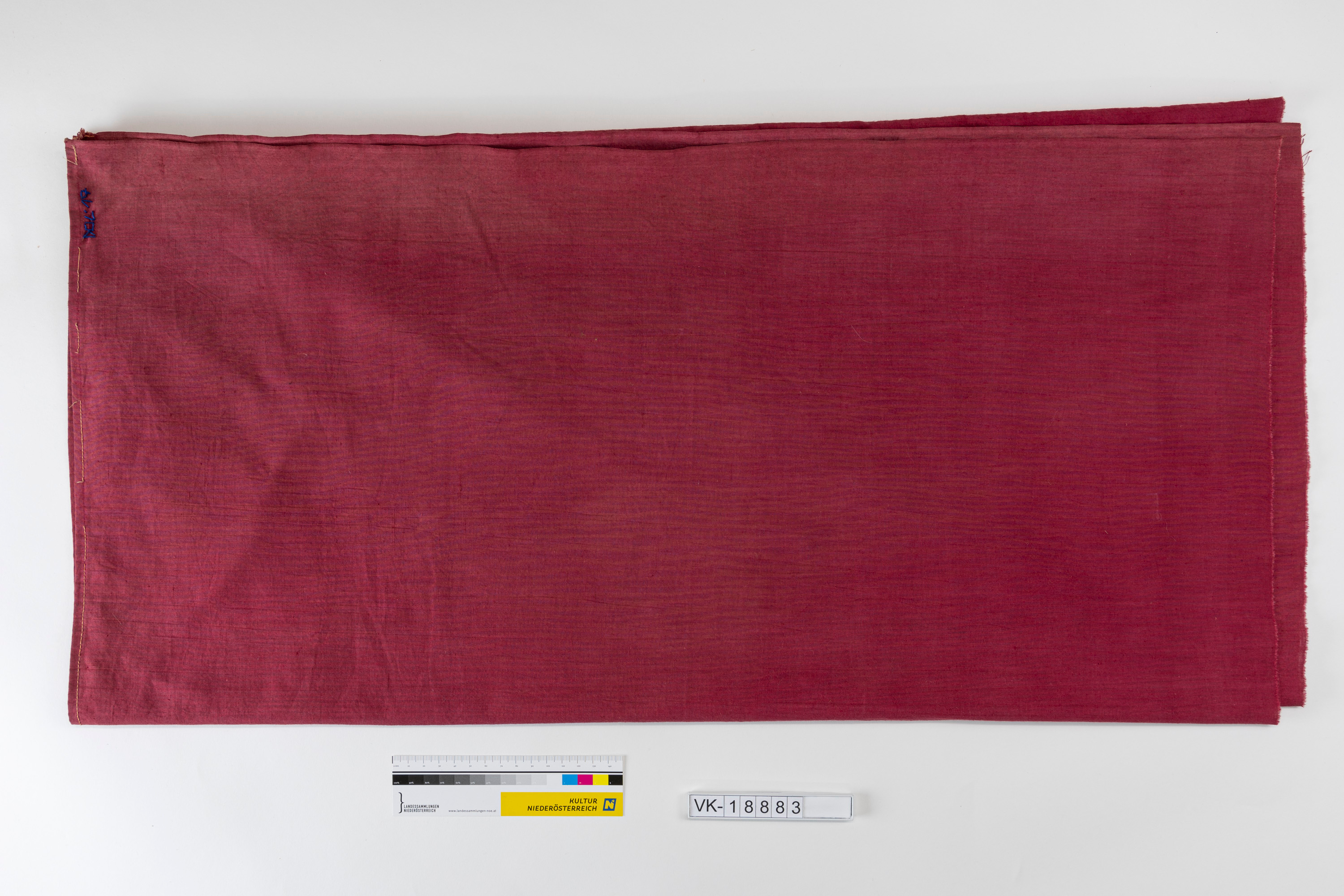 Roter Leinenstoff, aus zwei Teilen zusammen gesetzt, an einer Ecke mit blauem Garn bestickt.