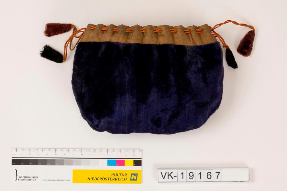 Geldbeutel aus schwarzblauem Samt, nach oben hin mit lachsrosa Seidentaft abschließend. Der Beutel ist mit einem doppelt verlaufenden orangen Zugband zu verschließen und mit rotem, mehrfärbig floral gemustertem Stoff gefüttert.