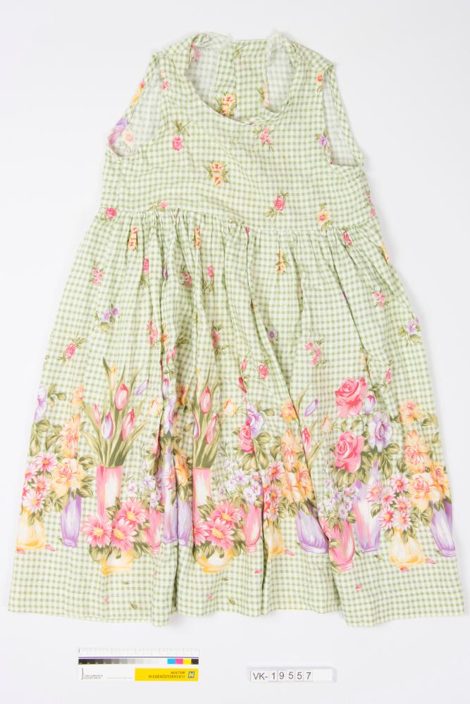 Ärmelloses langes Mädchenkleid mit rundem Halsausschnitt, in der Taille gezogen, mit einer Knopfleiste. Der Baumwollstoff ist grün- weiß kariert und mit einem Blumenmuster (verschiedene Vasen mit Sträußen) mehrfärbig bedruckt. Das Kleid hat ein Etikett: "(T?)OKIES".