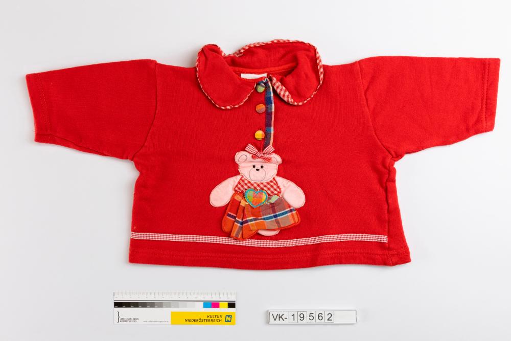 Roter Babypullover mit rundem Kragen und kurzer Knopfleiste. Vorne ist ein aus verschiedenen Stoffteilen genähtes Bärenmotiv appliziert, am Kragen und im Bereich des unteren Abschlusses befinden sich rot und weiß karierte Zierstreifen. Im Halsausschnitt ist ein Etikett: "idea immagine".